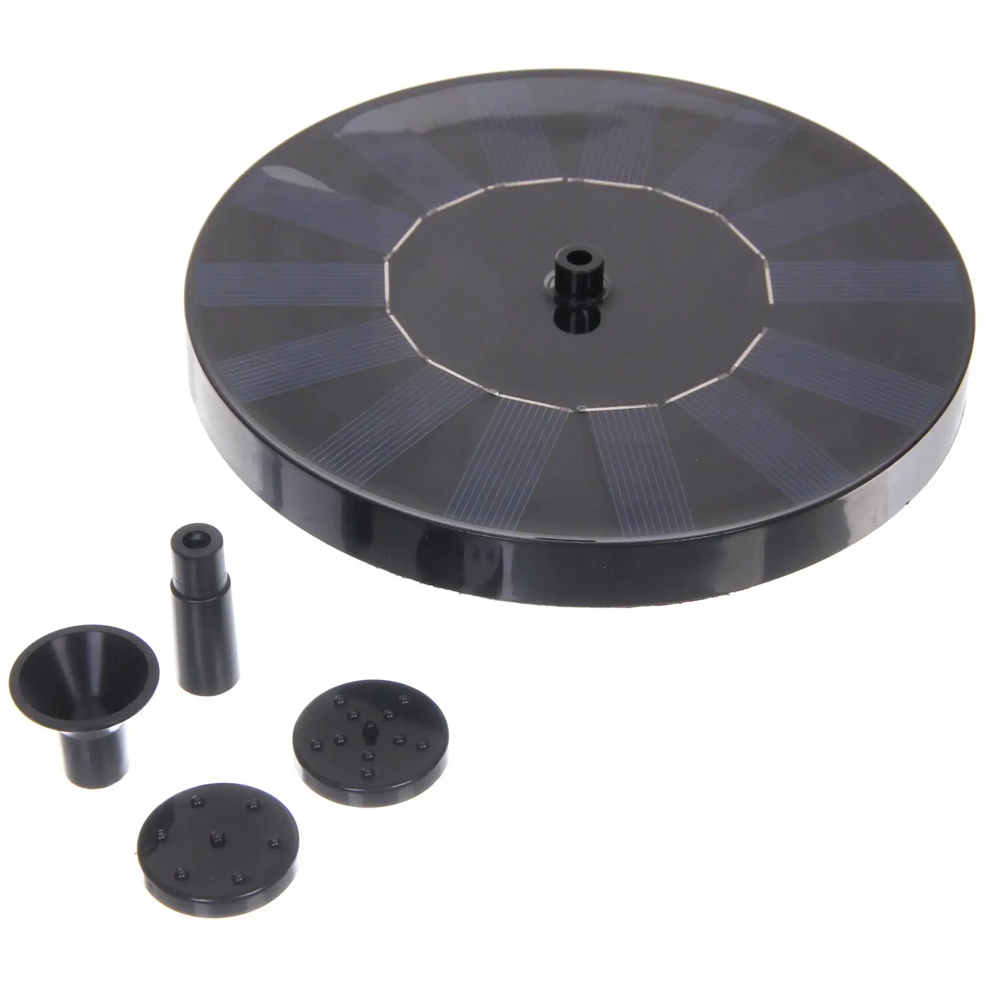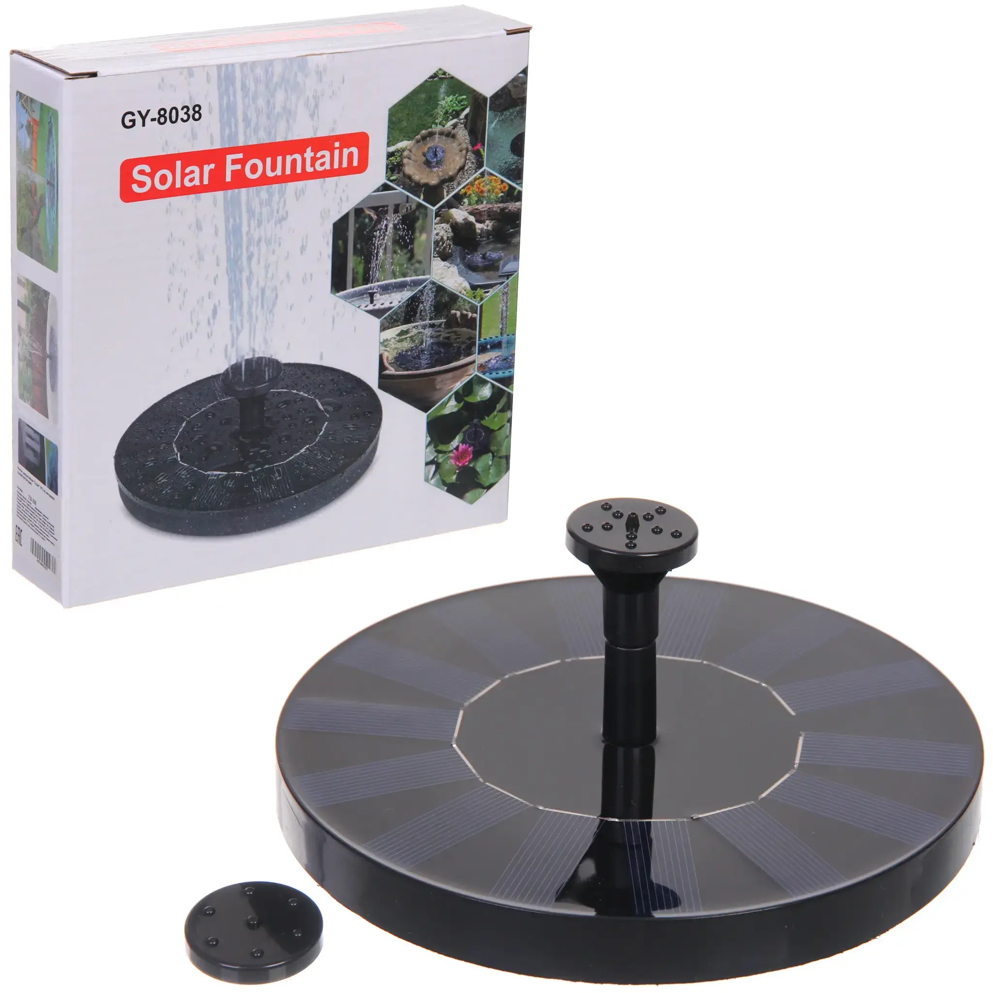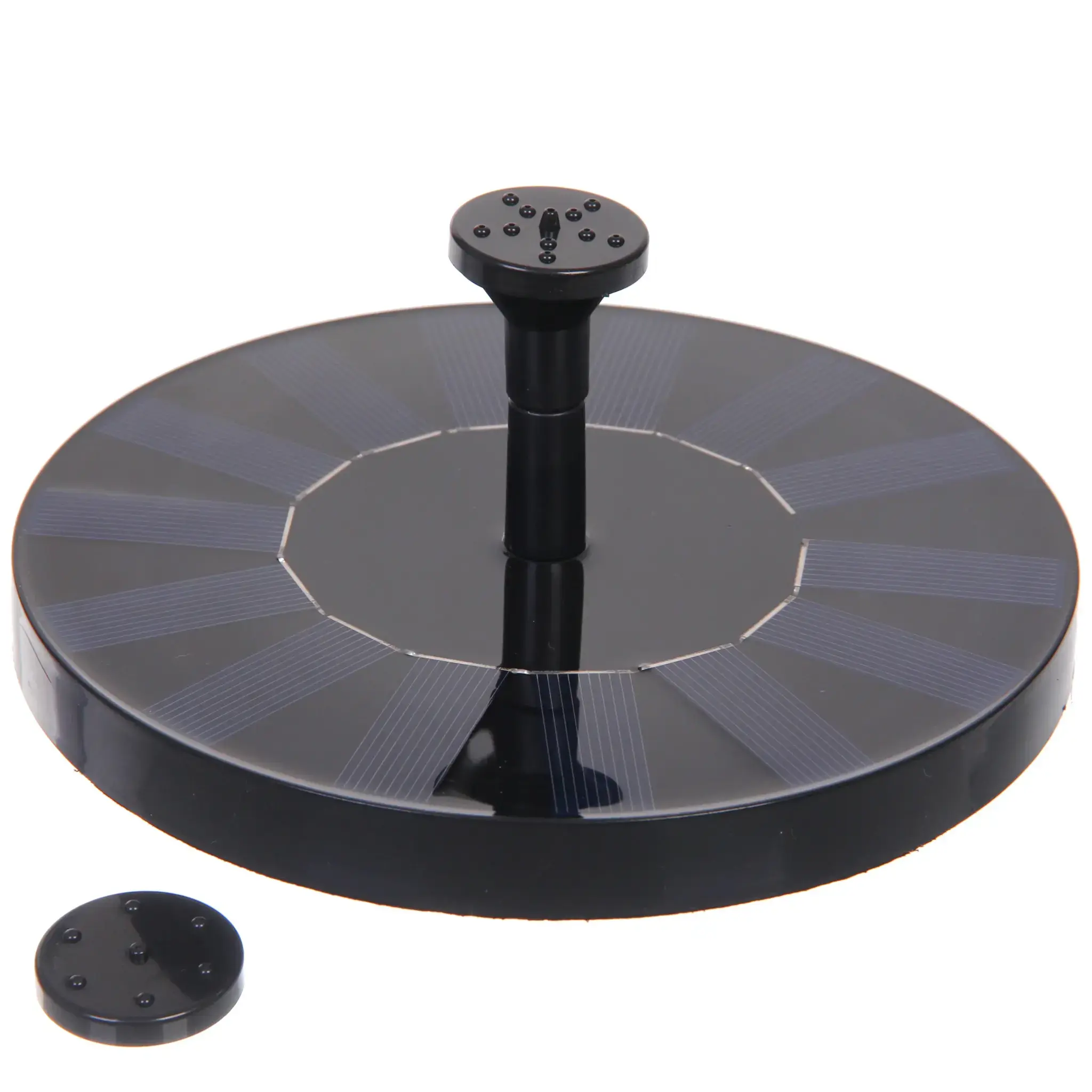 Круглое основание фонтана оснащено солнечными панелями, расположенными по окружности. Центральная часть имеет вертикальную трубку с отверстиями для формирования водяных струй. Благодаря продуманной конструкции, устройство легко устанавливается и не требует сложного обслуживания.