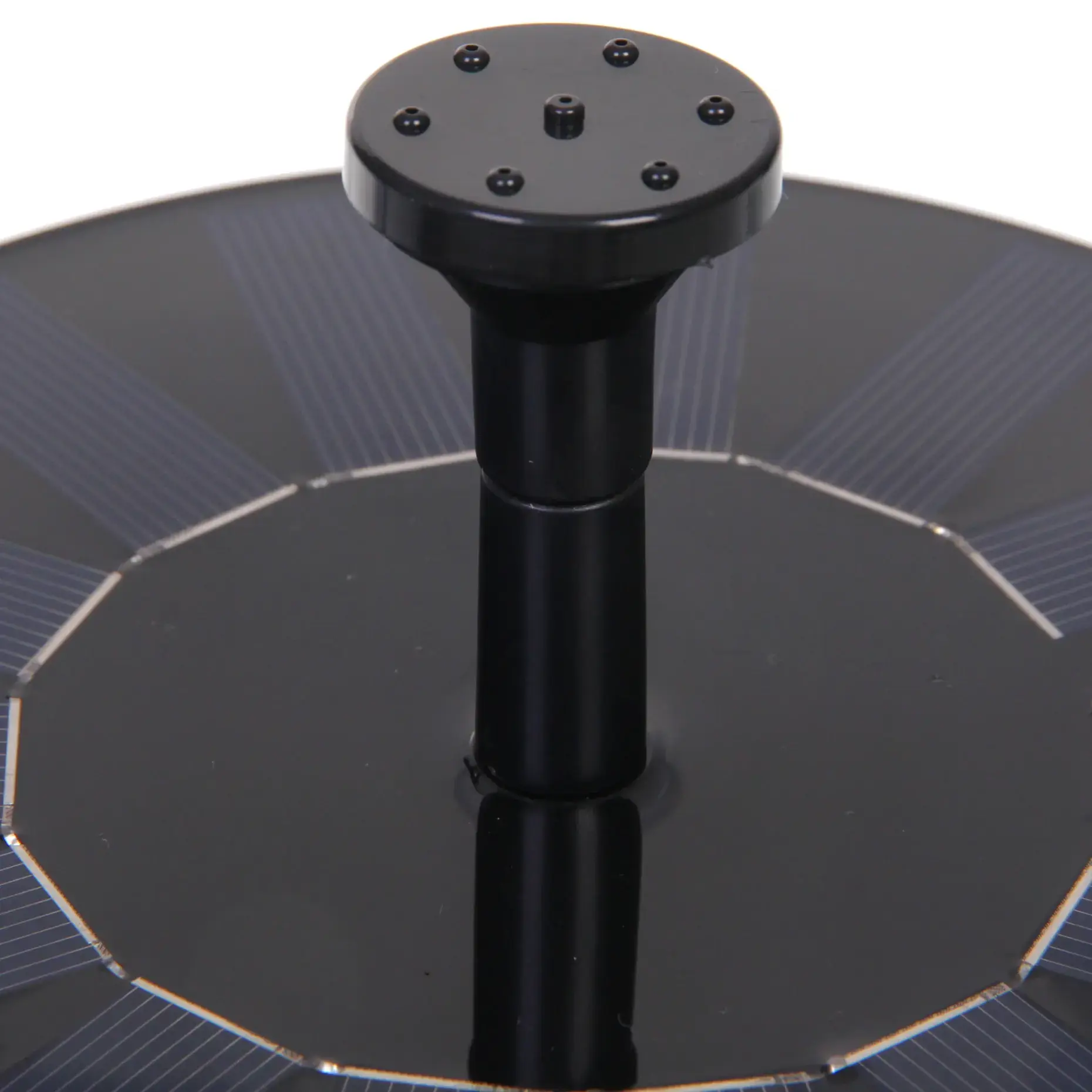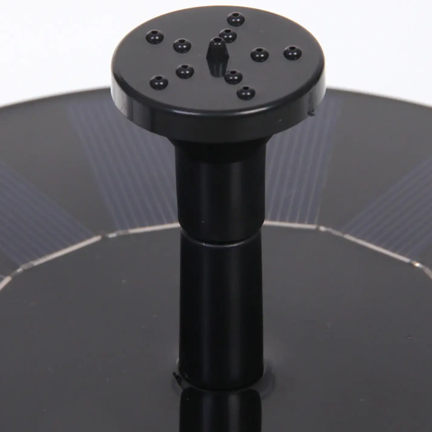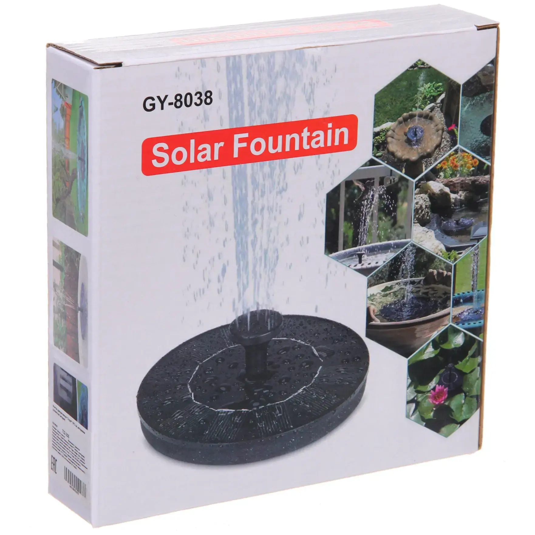 Круглое основание фонтана оснащено солнечными панелями, расположенными по окружности. Центральная часть имеет вертикальную трубку с отверстиями для формирования водяных струй. Благодаря продуманной конструкции, устройство легко устанавливается и не требует сложного обслуживания.