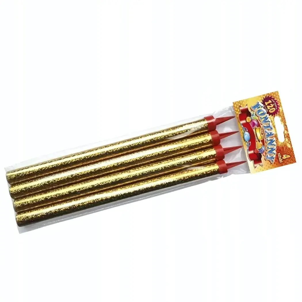 Размер фонтана составляет 23 см, что делает его идеальным для большинства тортов. Конфетти-ракетки имеют золотой корпус с блестками и красный наконечник, что придаёт им особый шарм. Упаковка содержит 4 ракетки, что позволяет создать эффектный фейерверк на вашем празднике.