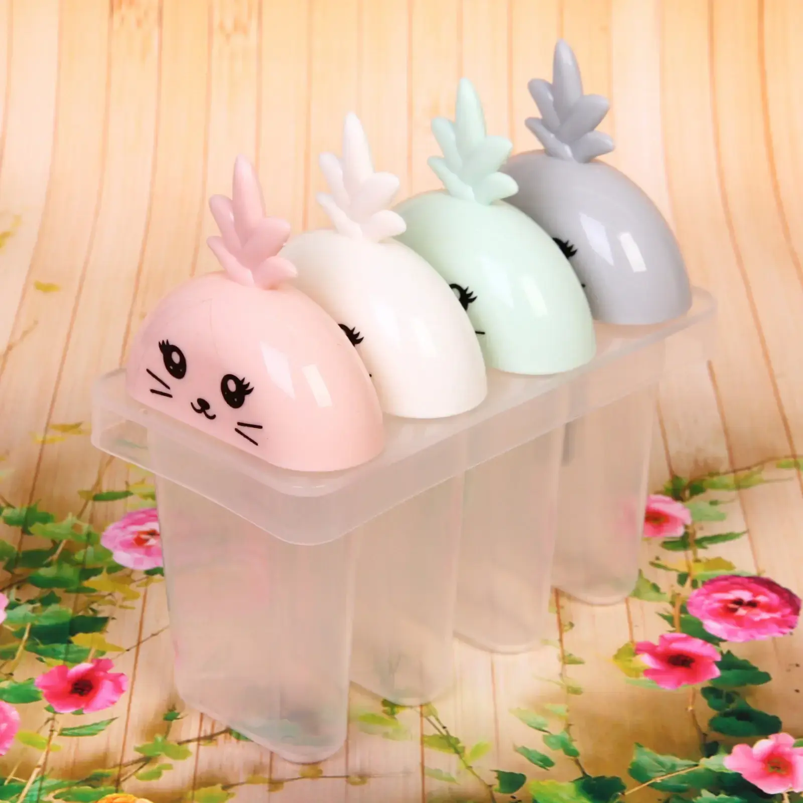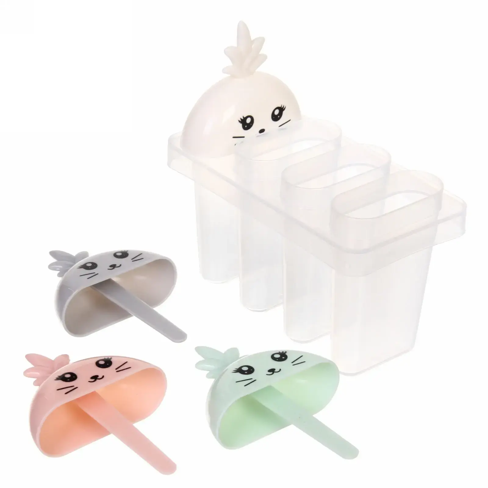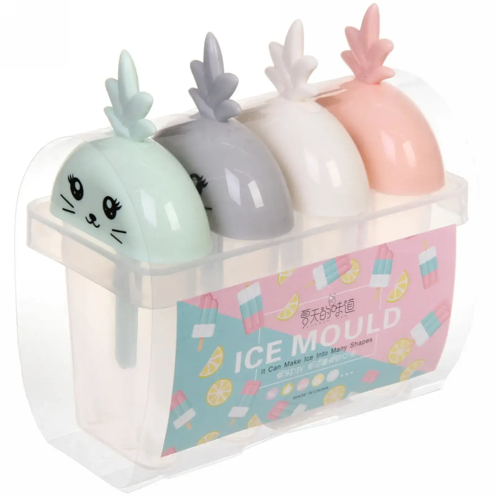 В набор входят четыре формы разных цветов: розовая, белая, мятная и серая. Каждая форма имеет округлую верхнюю часть и длинную ручку, что делает их удобными в использовании. Размеры форм не указаны, но они стандартные для подобных товаров, что позволяет легко замораживать небольшие порции. Прозрачная подставка, в которой размещены формы, обеспечивает их стабильность и удобство хранения.