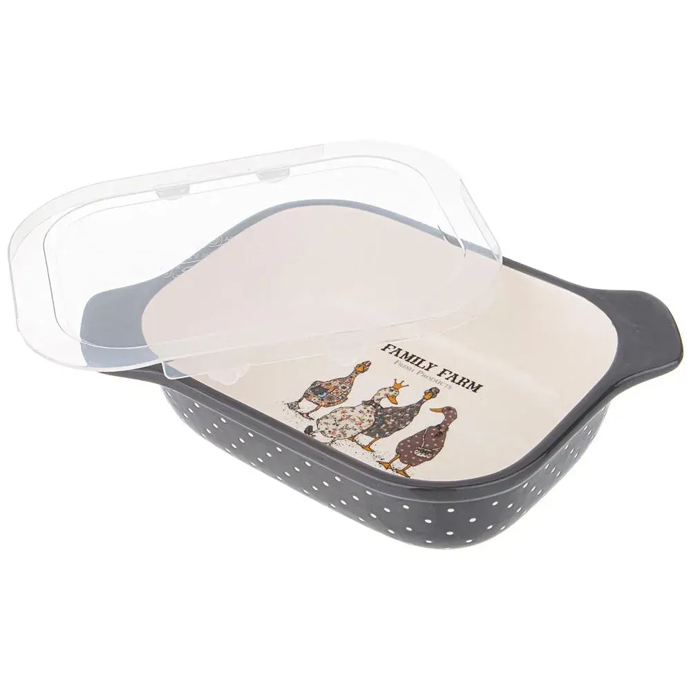 Керамическая форма для запекания Agness "Family Farm" с пластиковой крышкой сочетает практичность и стиль. Уникальный дизайн с изображением уток и надписью создаёт уютную атмосферу семейных обедов. Герметичная крышка сохраняет аромат и свежесть блюд при хранении в холодильнике.