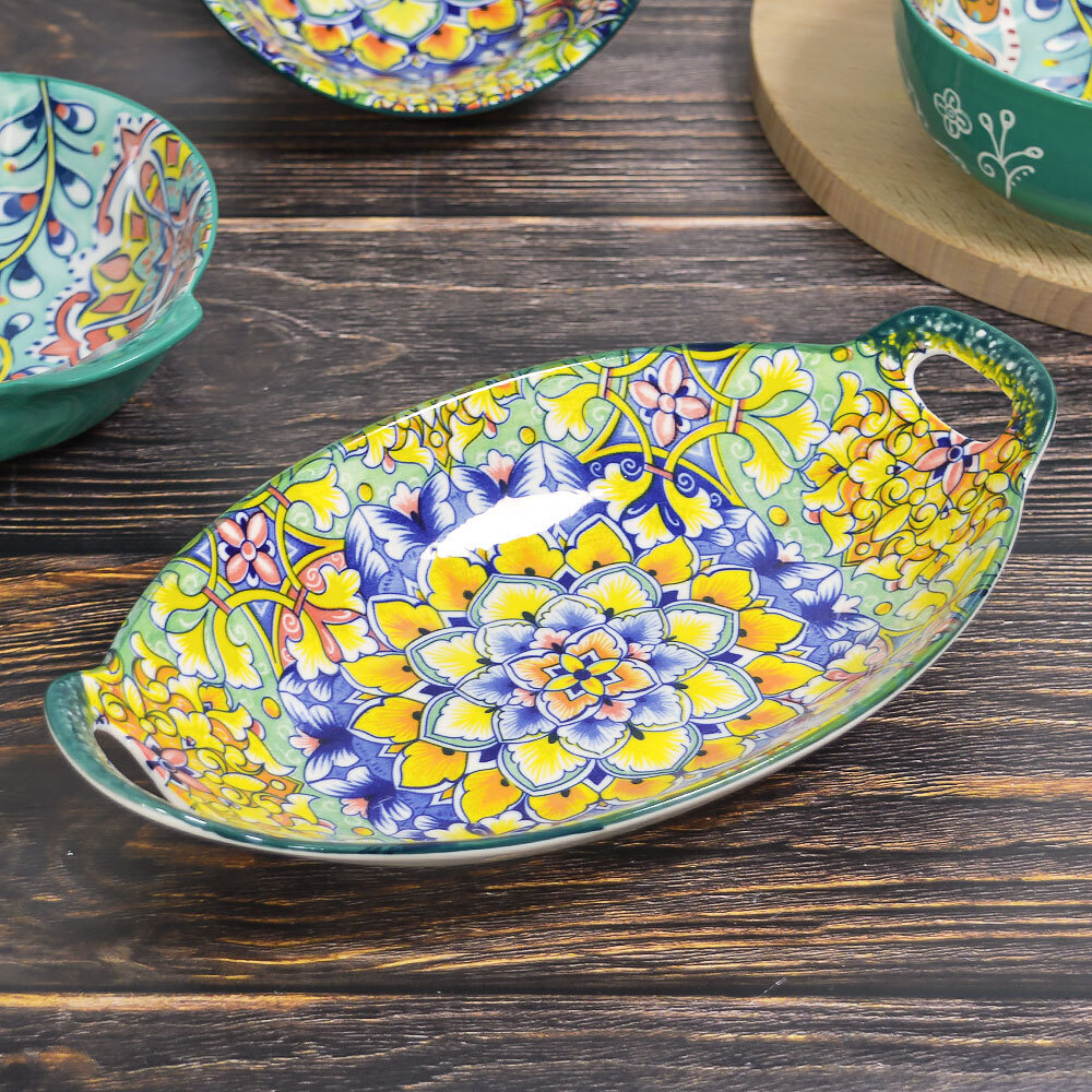 Эта форма для запекания 'Arabesque' станет незаменимым элементом вашей кухни, обеспечивая комфорт и стиль в процессе приготовления блюд. Яркие цветочные узоры и геометрические элементы делают её не только функциональной, но и эстетически привлекательной. С её помощью вы сможете готовить и подавать блюда с изяществом и вкусом.