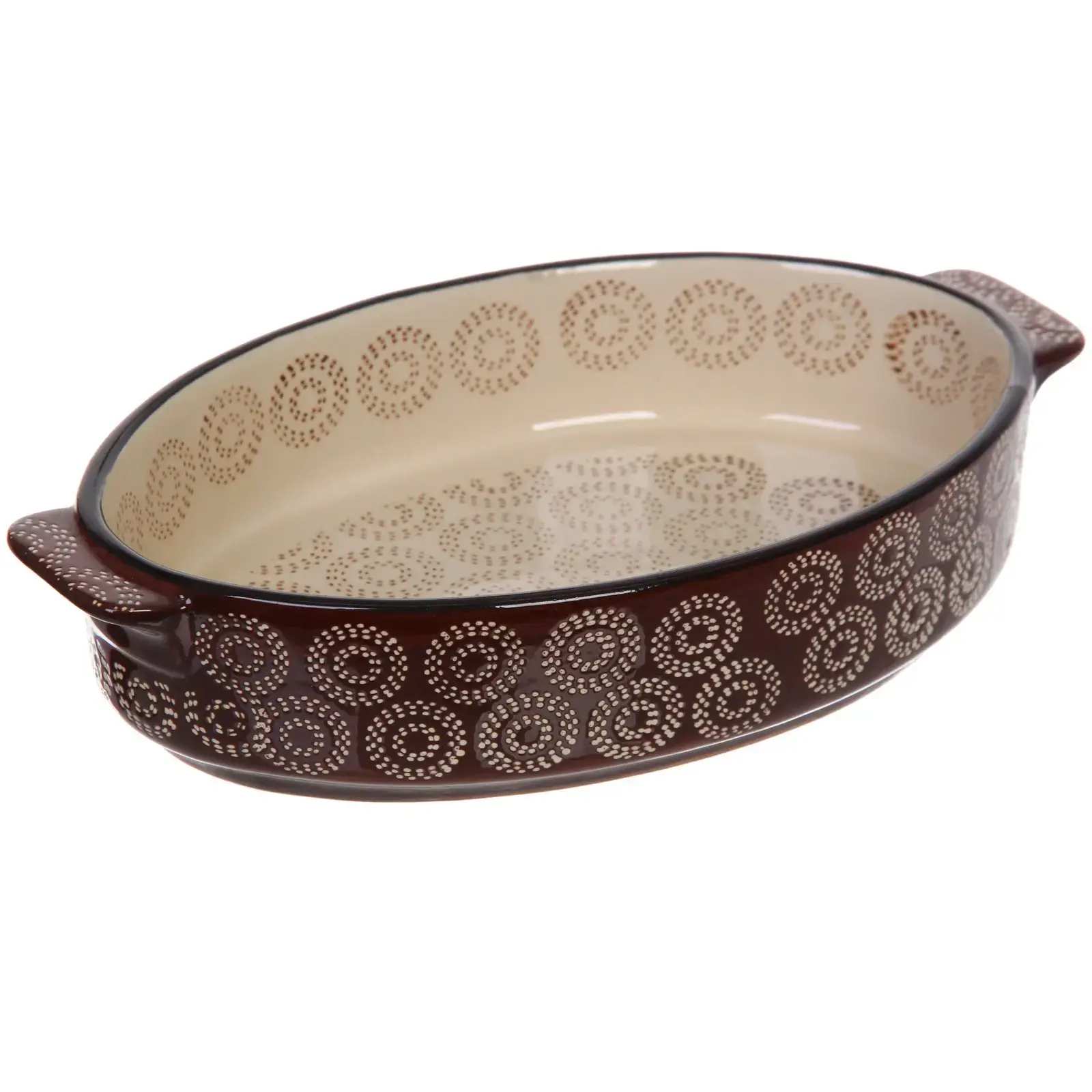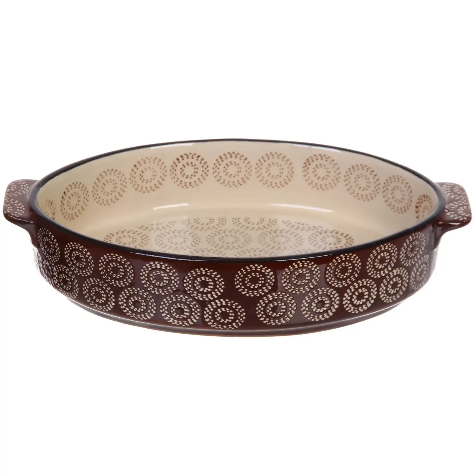 Керамика, из которой изготовлена форма, обеспечивает равномерное прогревание и сохранение тепла, что позволяет вашим блюдам оставаться горячими дольше. Темно-коричневый цвет с узором в виде спиралей придаёт изделию уникальный вид, а светлая внутренняя поверхность облегчает процесс мытья. Форма устойчива к высоким температурам и легко очищается, что делает её идеальным выбором для активного использования.