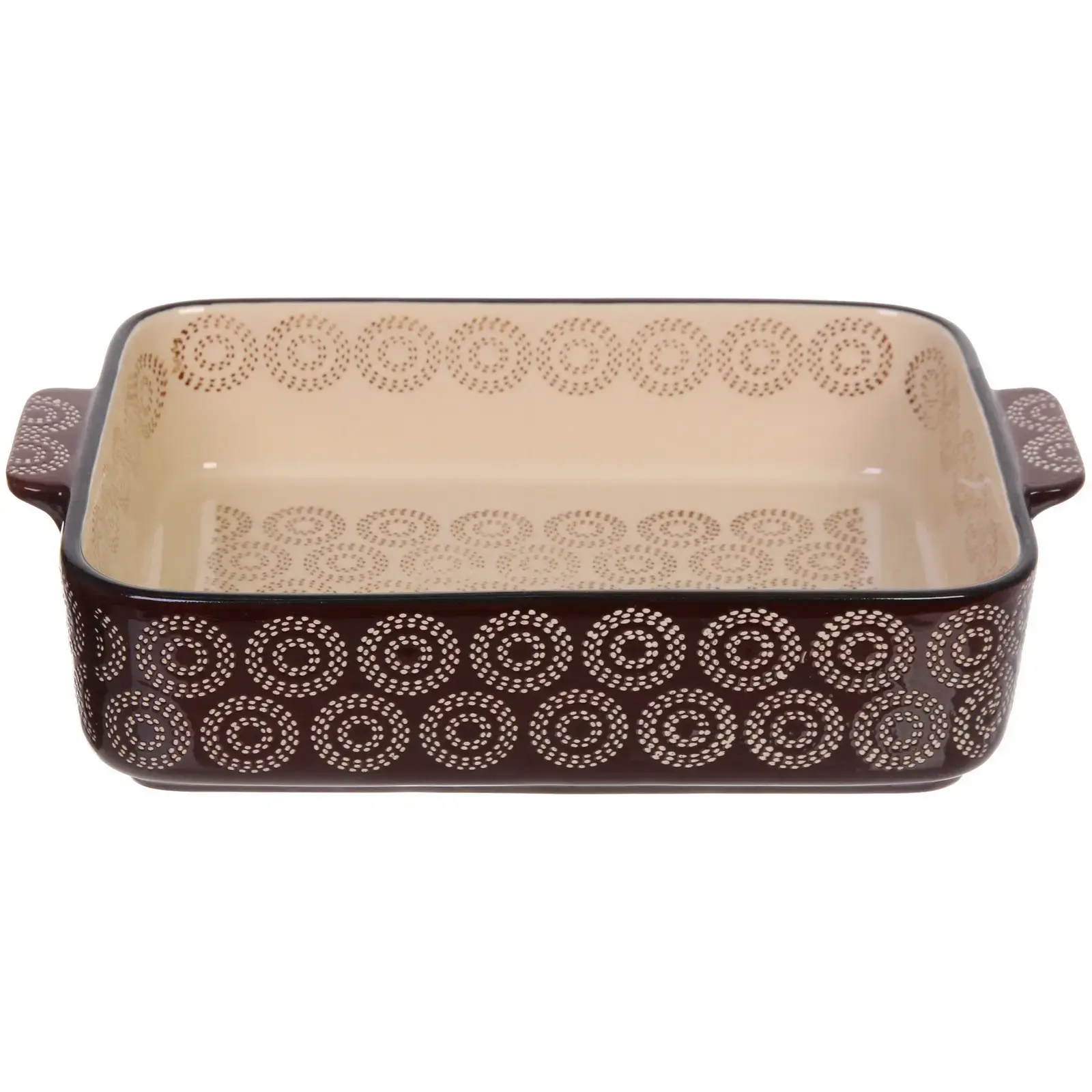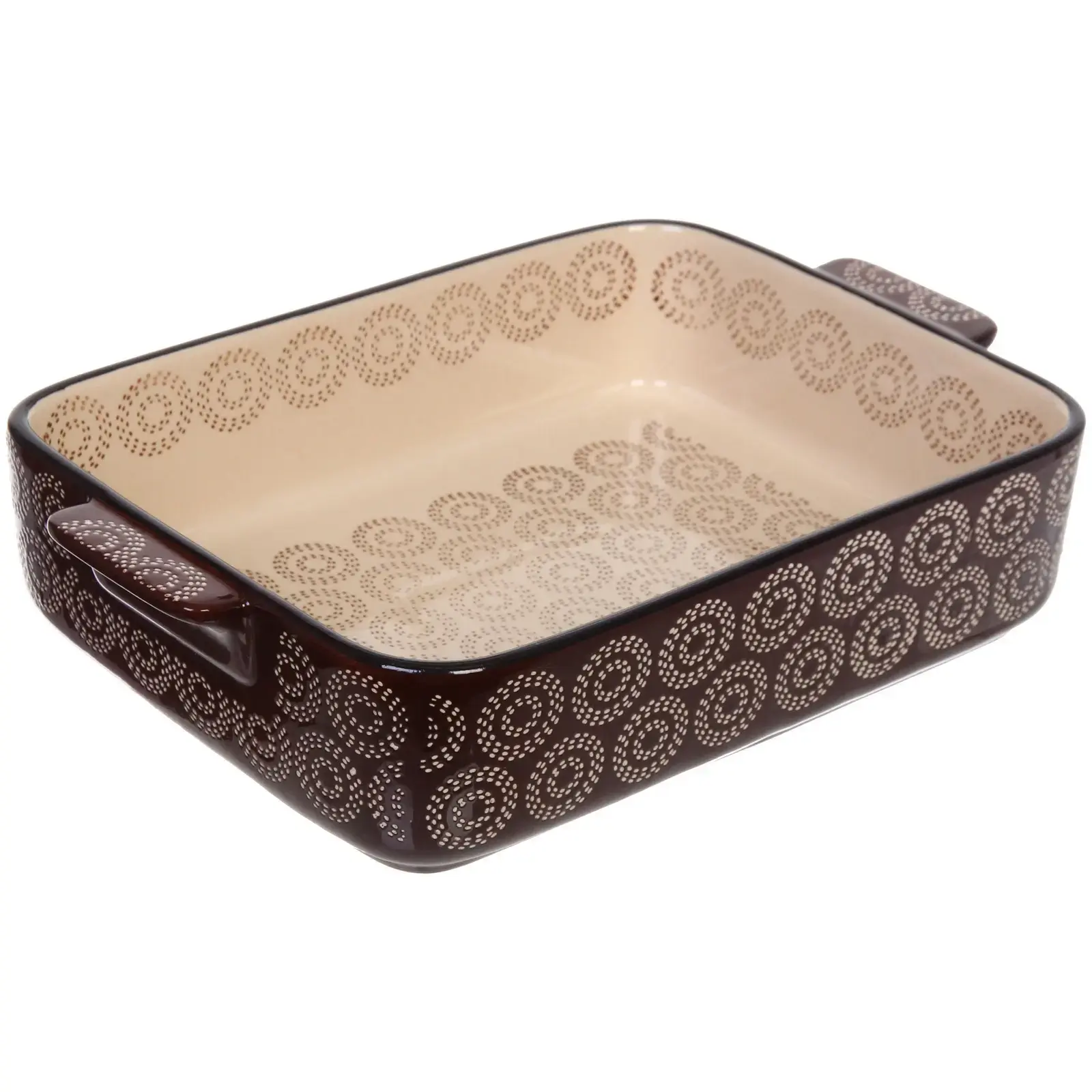 Размеры формы составляют 28х18,5х6,5 см, что делает ее универсальной для большинства рецептов. Внешняя поверхность темно-коричневого цвета, а внутренняя — светло-кремовая с декоративными узорами, что придает изделию эстетичный вид. Форму можно мыть вручную и в посудомоечной машине, что делает ее использование еще более удобным.