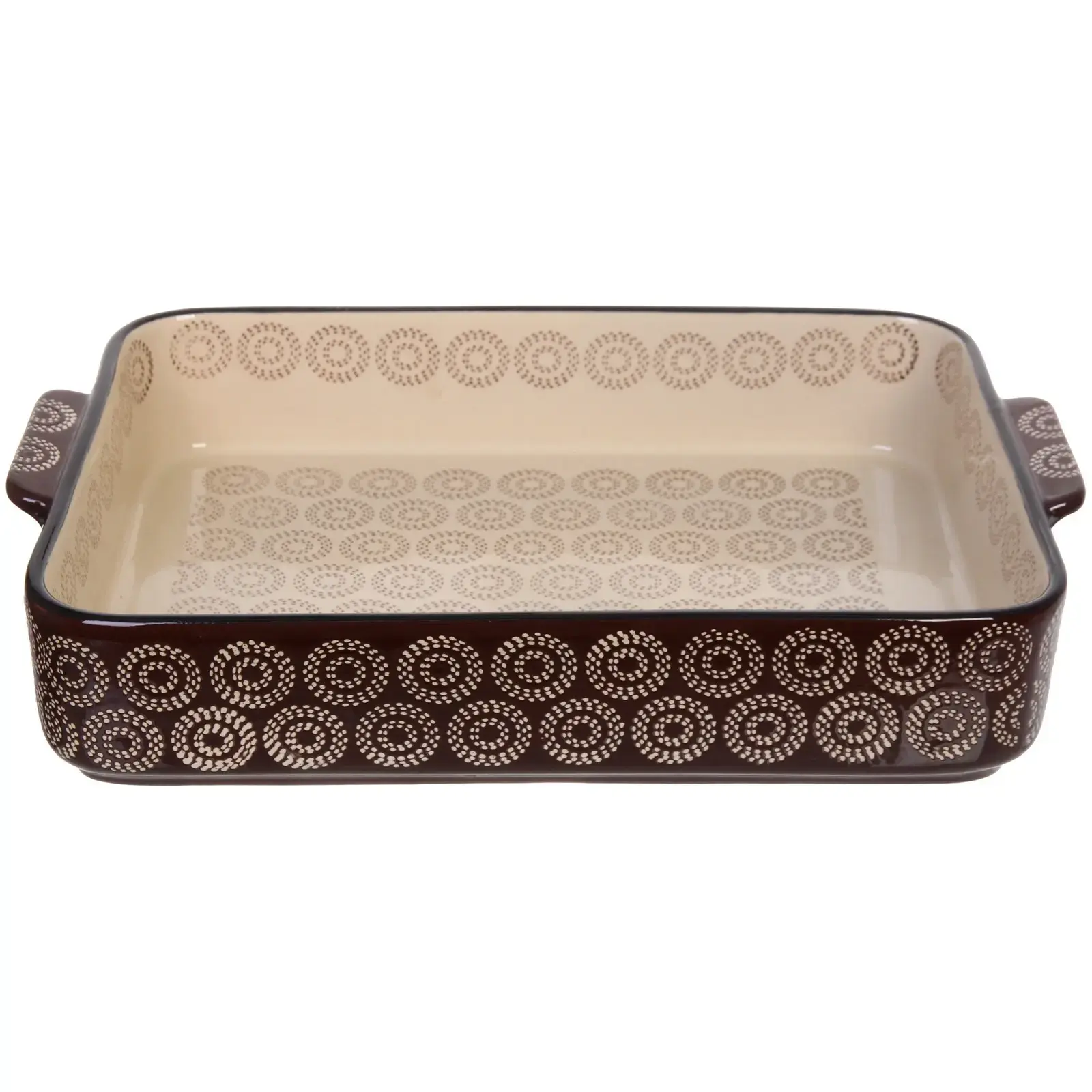 Форма выполнена в темно-коричневом цвете с светлым бежевым внутренним покрытием и украшена узорами в виде завитков. Она идеально подходит для запекания мяса, овощей, а также для приготовления запеканок и десертов. Не забывайте, что форма не предназначена для использования на газовых конфорках и открытом огне, а также на электрических и индукционных плитах.
