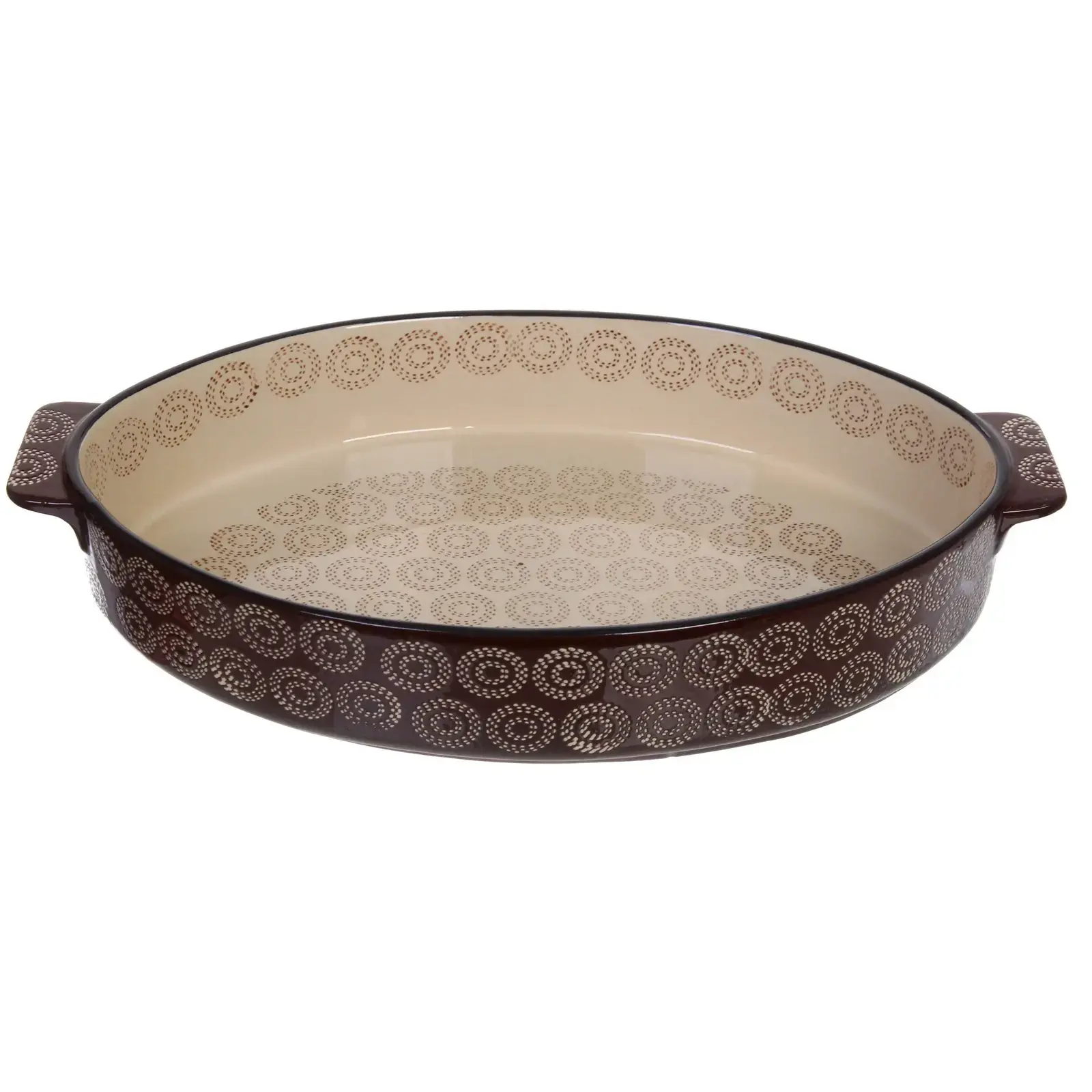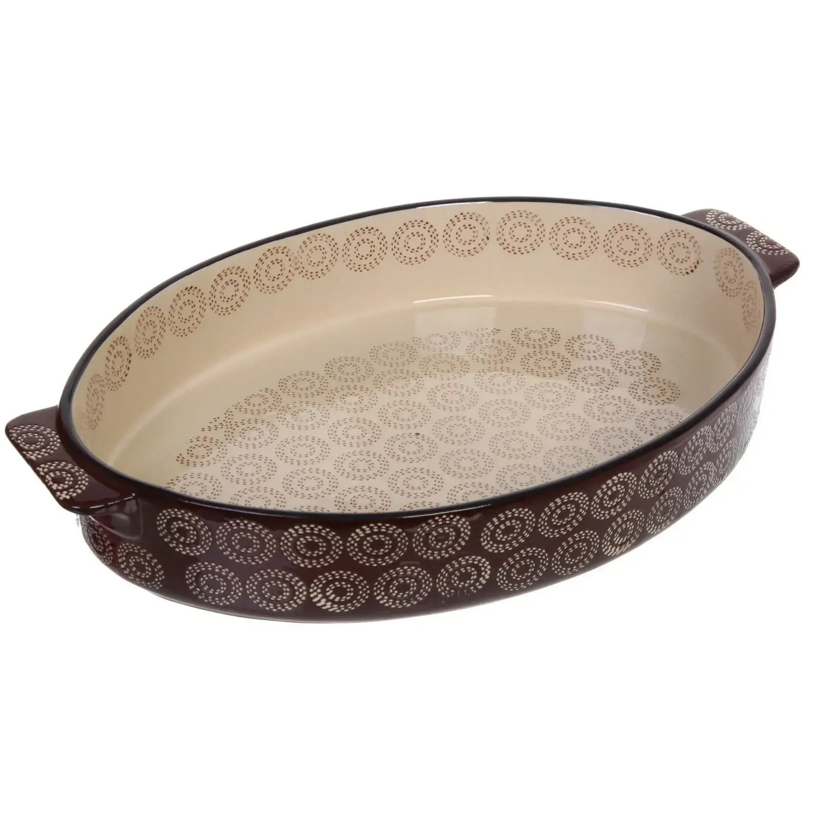 Форма выполнена из высококачественной керамики, что гарантирует её долговечность и надежность. Внутренняя поверхность светлого кремового цвета без узоров облегчает процесс очистки, а внешняя сторона с узором в золотистых тонах придаёт изделию уникальный вид. Размеры формы 39х23,5х6,5 см делают её универсальной для различных рецептов.