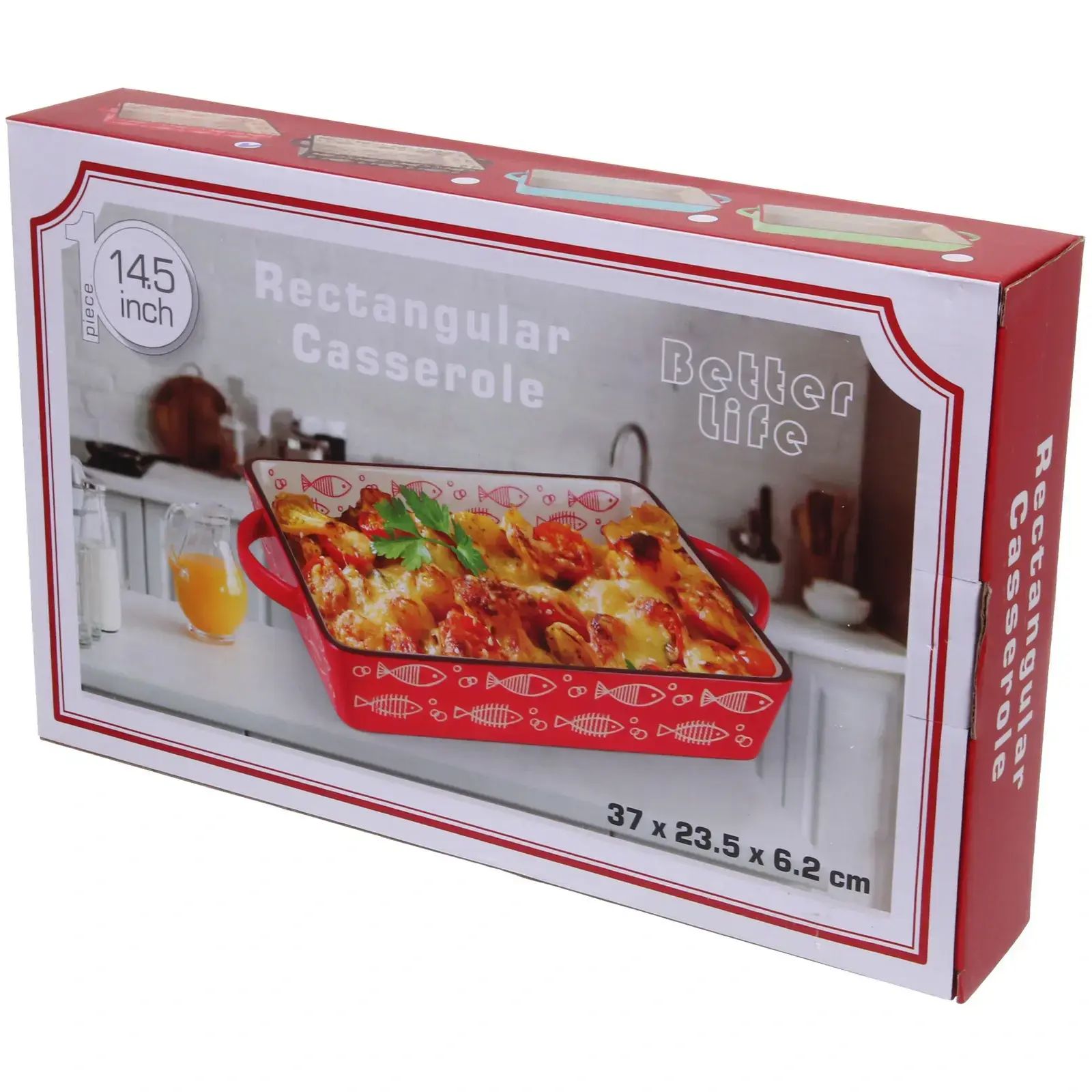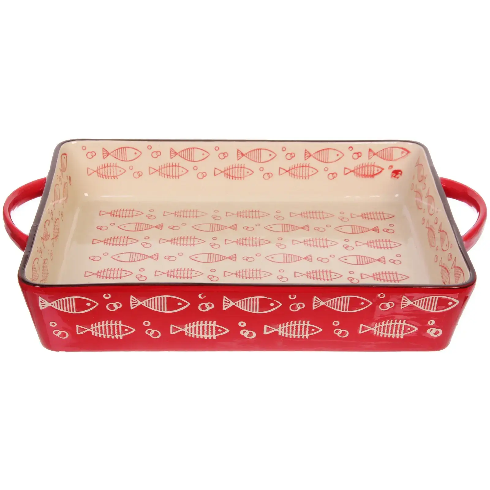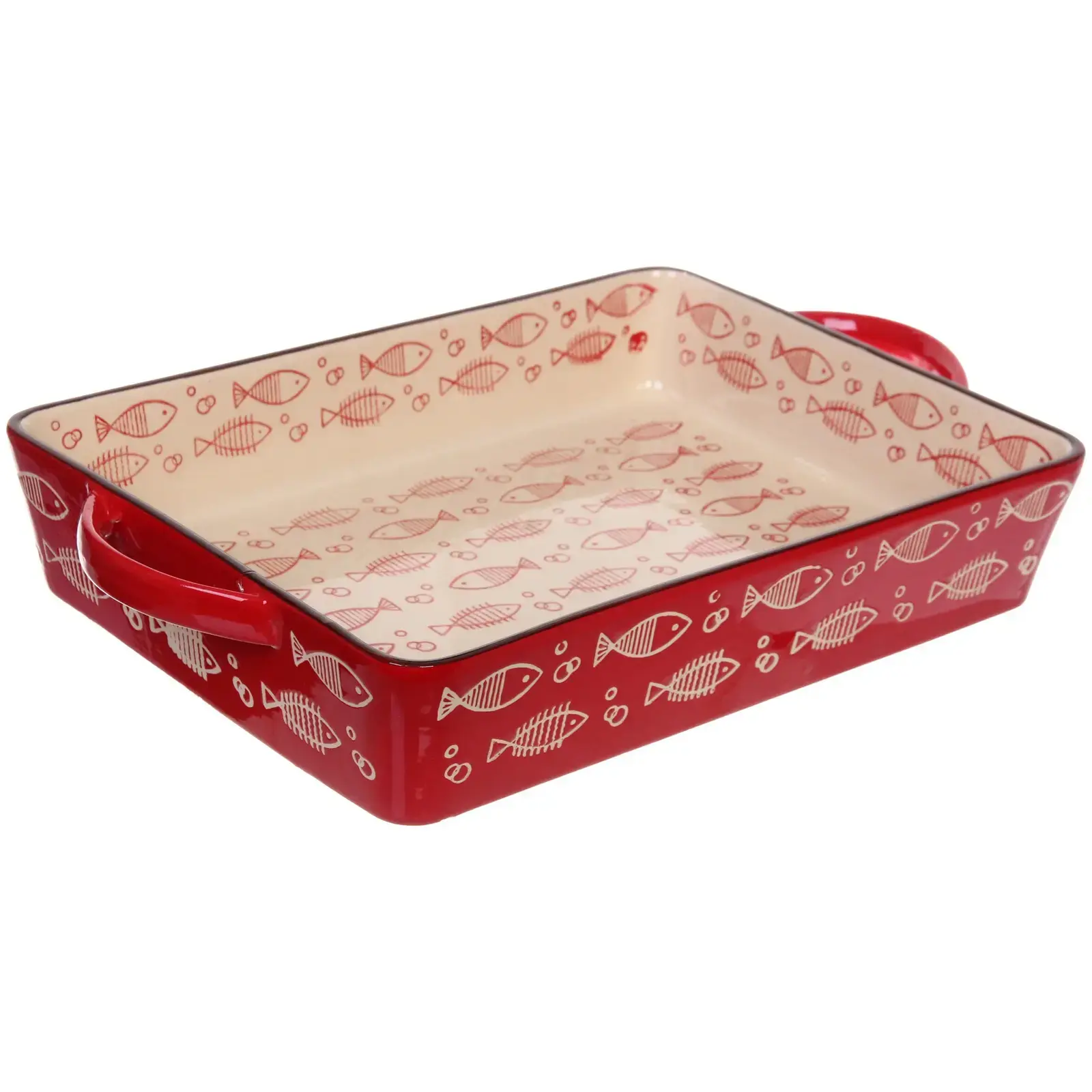 Размеры формы составляют 38х24х6 см, что делает её идеальной для запекания порционных блюд. Внутренняя поверхность кремового цвета с узором рыбок добавляет изюминку, а внешняя сторона ярко-красного цвета привлекает внимание. Эта форма станет отличным выбором для тех, кто ценит качество и стиль на своей кухне.