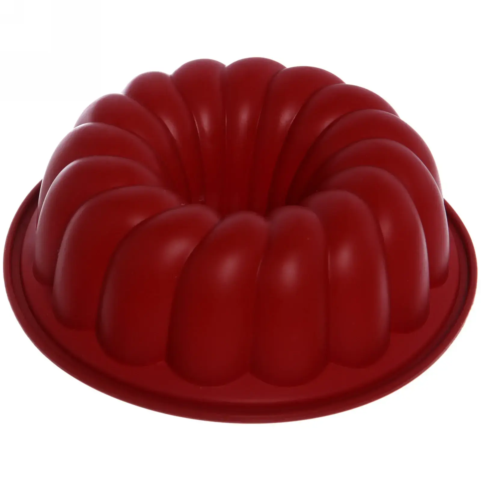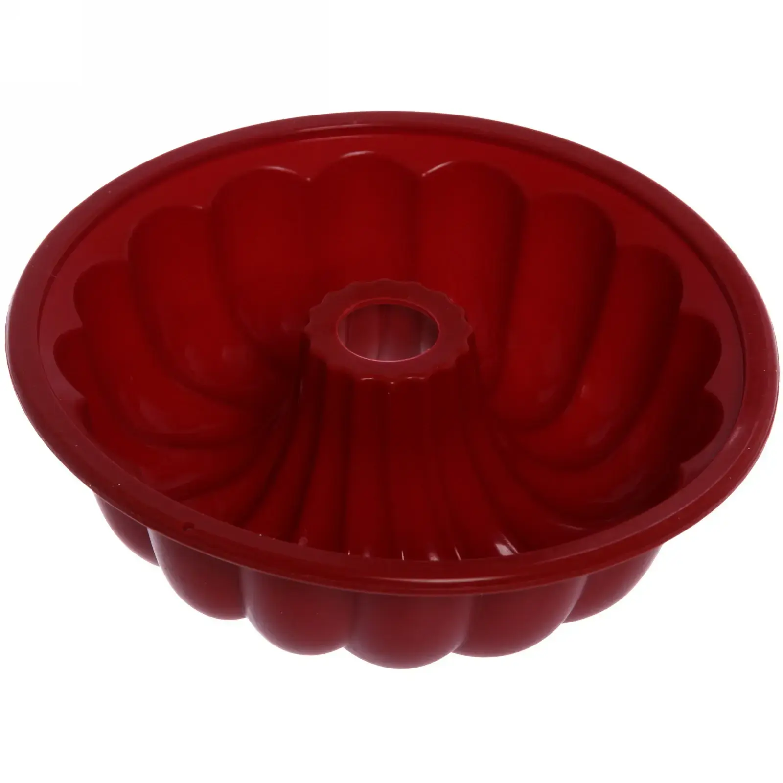 Форма диаметром 24 см и высотой 7.5 см с центральным отверстием обеспечивает равномерный нагрев. Темно-красный цвет устойчив к выцветанию, а рифлёная поверхность создаёт красивый рельеф на готовых изделиях. Вес 320 г делает форму удобной для переноски и работы с жидким тестом.
