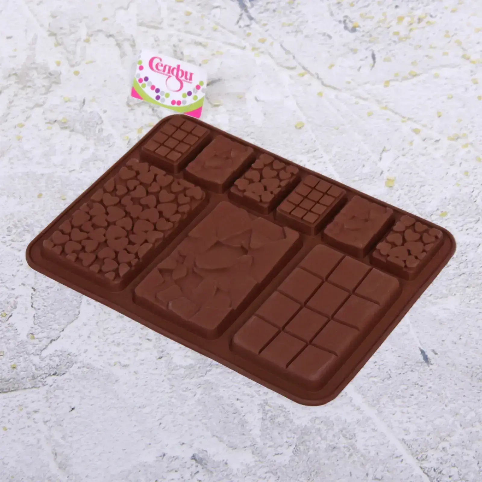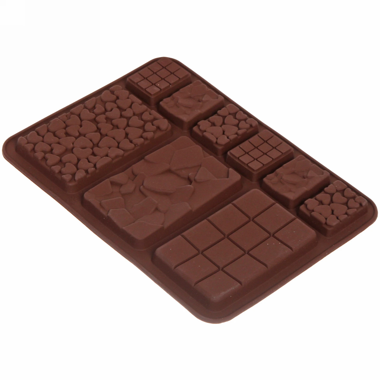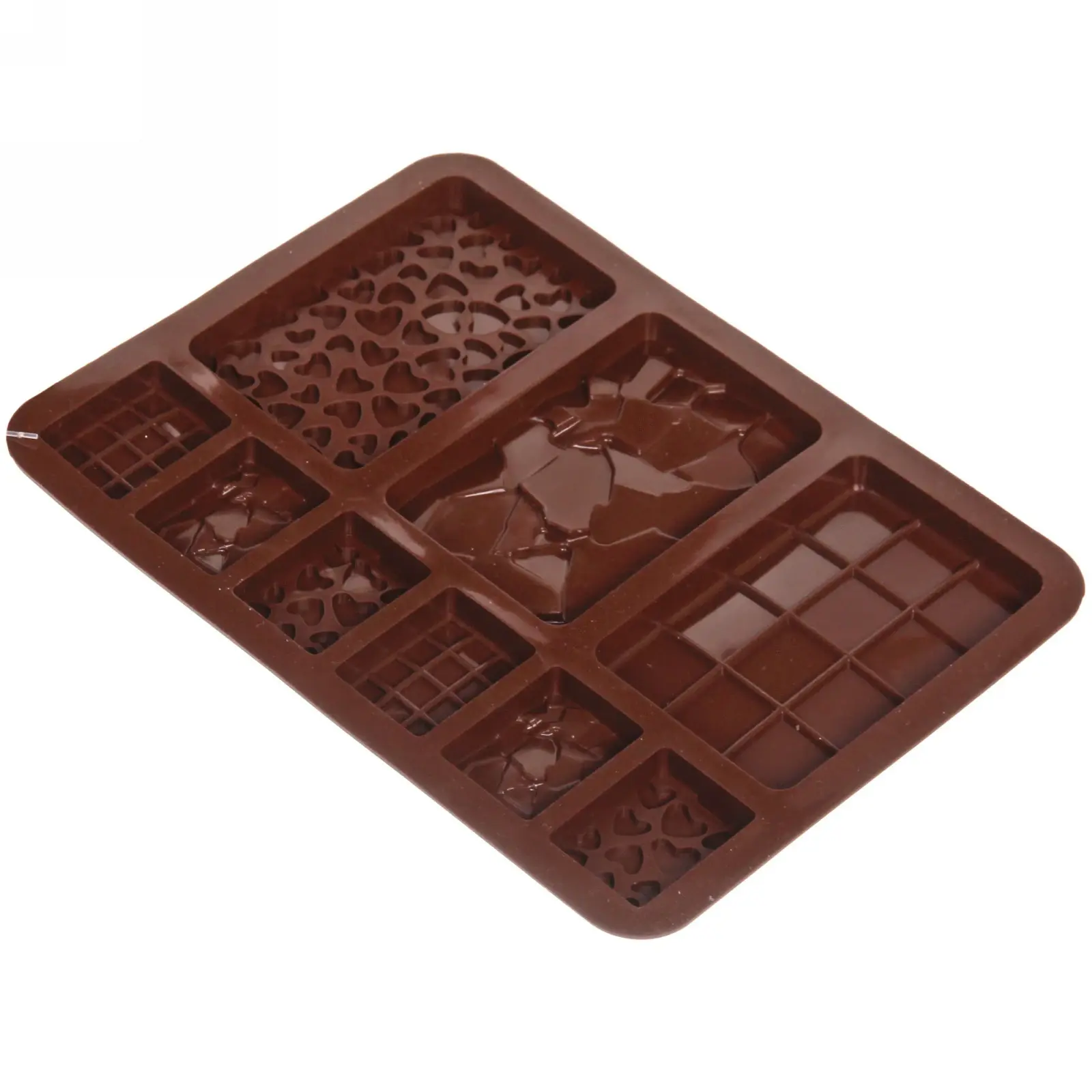 Форма имеет размеры 20,1х14,1х0,8 см и выполнена в коричневом цвете, который напоминает шоколад. Она оснащена множеством ячеек различных форм, включая сердца и квадраты, что позволяет вам экспериментировать с дизайном ваших сладостей. Силиконовая форма устойчива к высоким температурам, что делает её подходящей как для выпекания, так и для замораживания. Вы можете использовать её для создания уникальных десертов на праздники или просто для радости близких.
