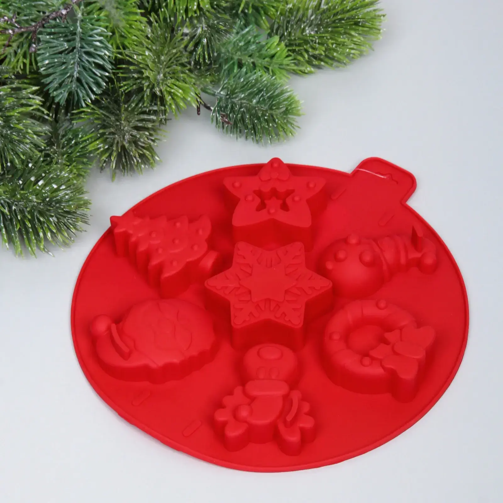 Порадуйте близких оригинальными новогодними десертами! Силиконовая форма с шестью ячейками в виде праздничных символов станет вашим надежным помощником на кухне.