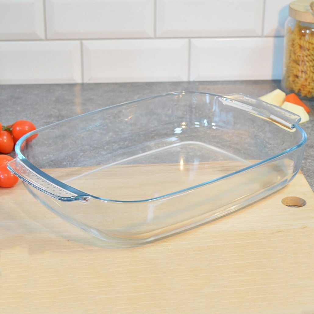 Форма имеет прямоугольные размеры 34×22×6 см и отличается элегантным дизайном с закруглёнными углами. Благодаря прозрачности, вы сможете следить за процессом приготовления, не открывая духовку. Эстетичный вид формы позволит подавать блюда прямо в ней, не используя дополнительную посуду для сервировки.