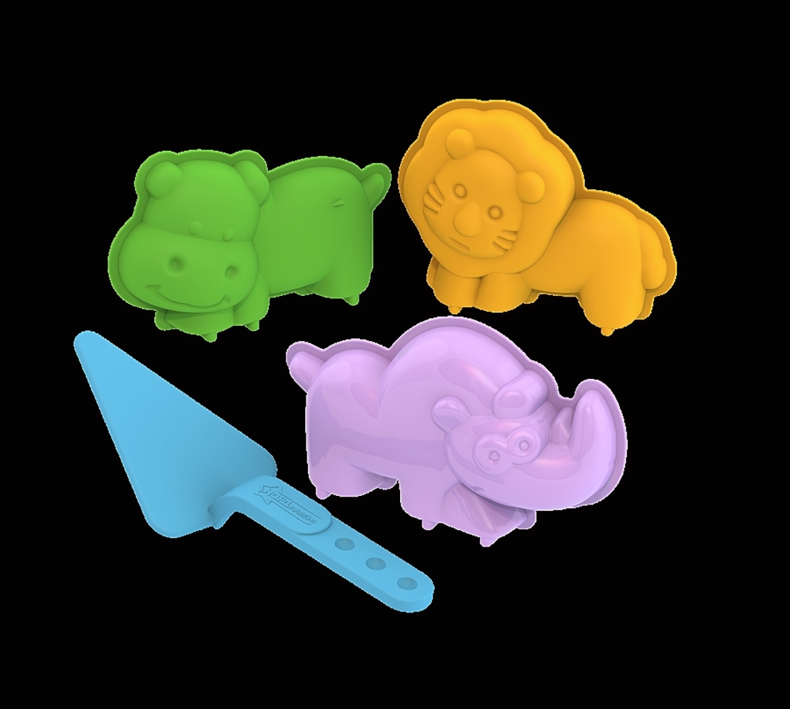 - 3 яркие формочки в виде африканских животных: Лев, Носорог и Бегемот.