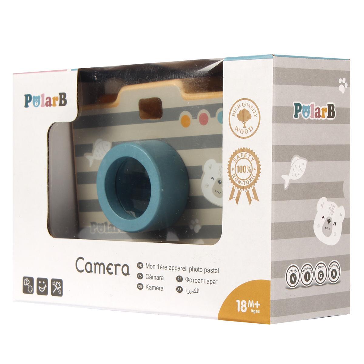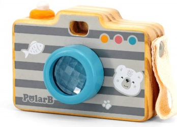Размеры фотоаппарата составляют 105 мм в длину, 78 мм в высоту и 45 мм в ширину. Он упакован в красочную коробку с окошком, что делает его отличным вариантом для подарка. Игрушка выполнена в светлом древесном цвете с серыми и цветными полосами, а также украшена изображениями медведя и рыбки, что делает ее привлекательной для детей обоих полов.