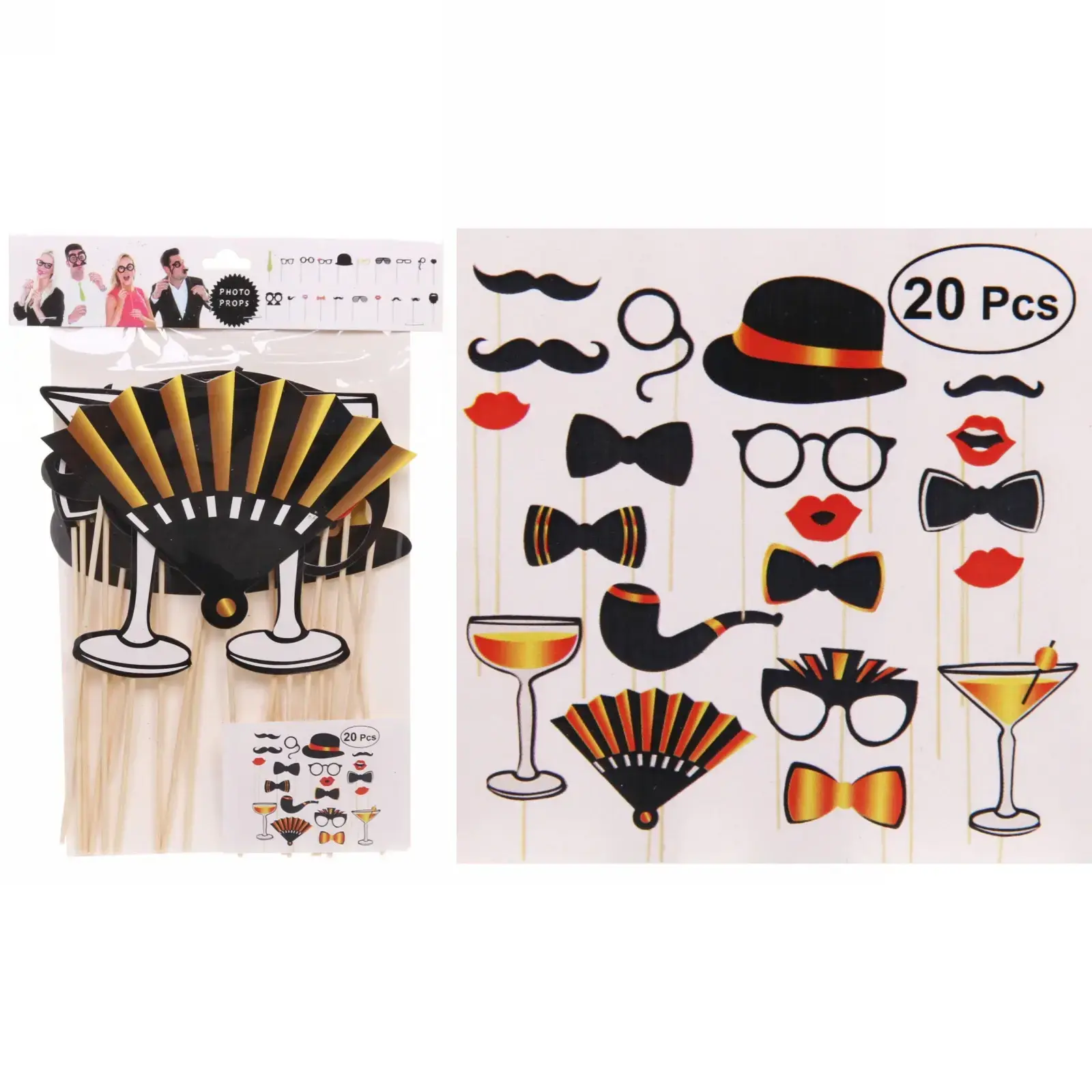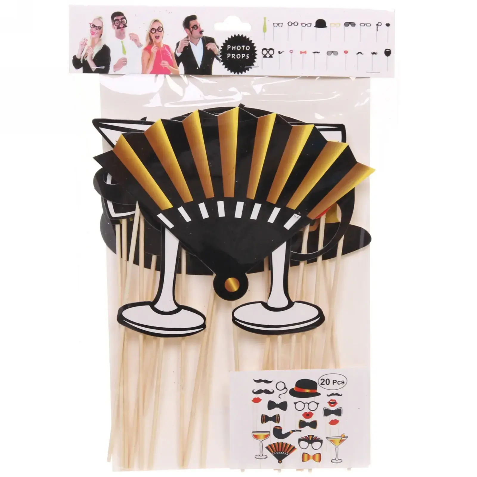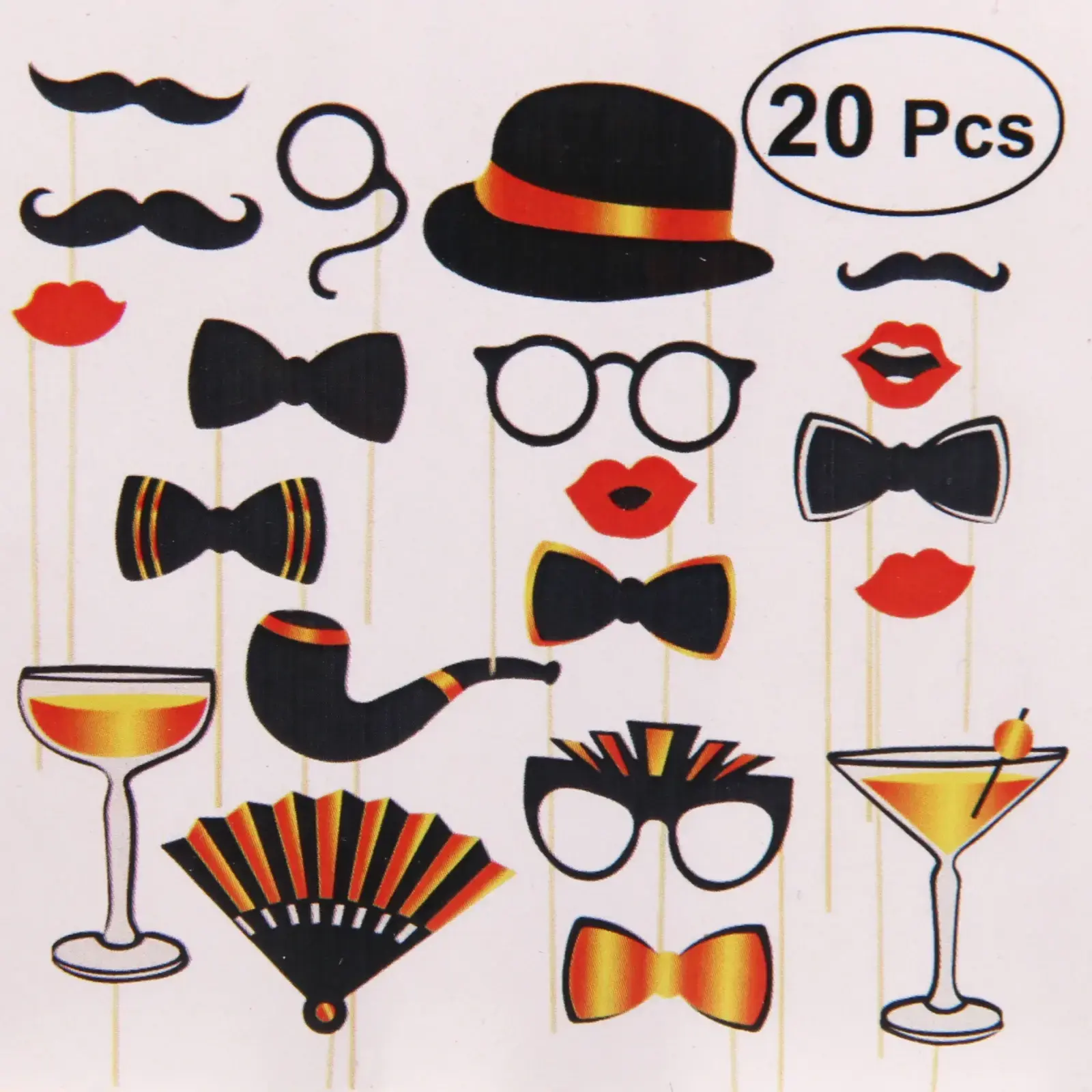 Набор включает в себя разнообразные элементы, такие как стильные шляпы, очки, усы, губы, бабочки и бокалы, выполненные из качественного картона и дерева. Каждый аксессуар крепится на тонкую деревянную палочку, что позволяет удобно держать их во время фотосессий. Яркая цветовая гамма с элементами черного, золотого и красного делает их привлекательными и заметными для ваших гостей.