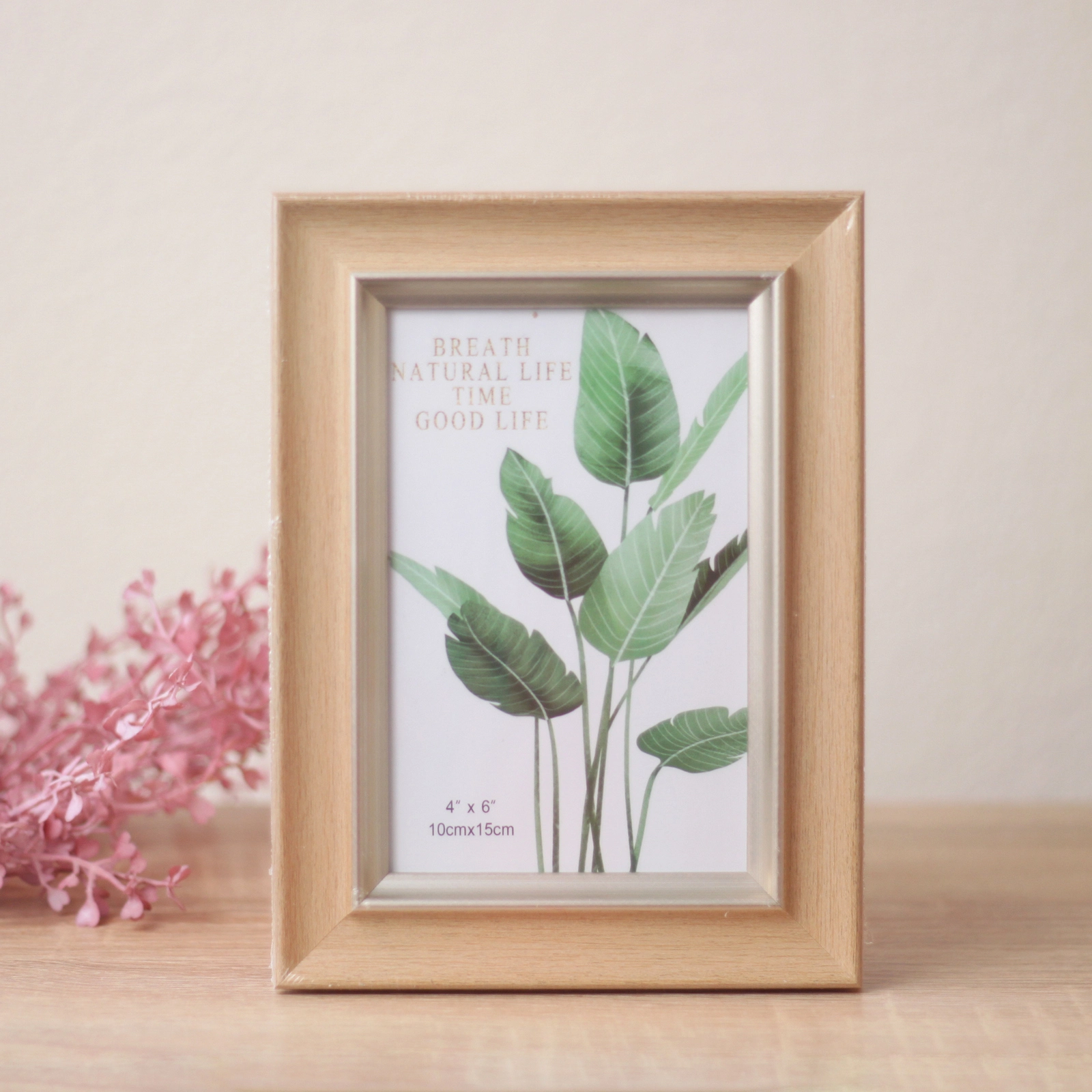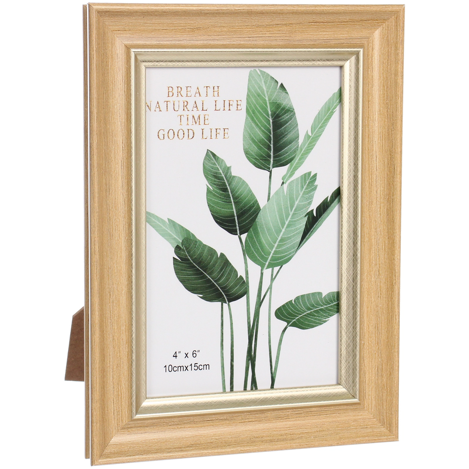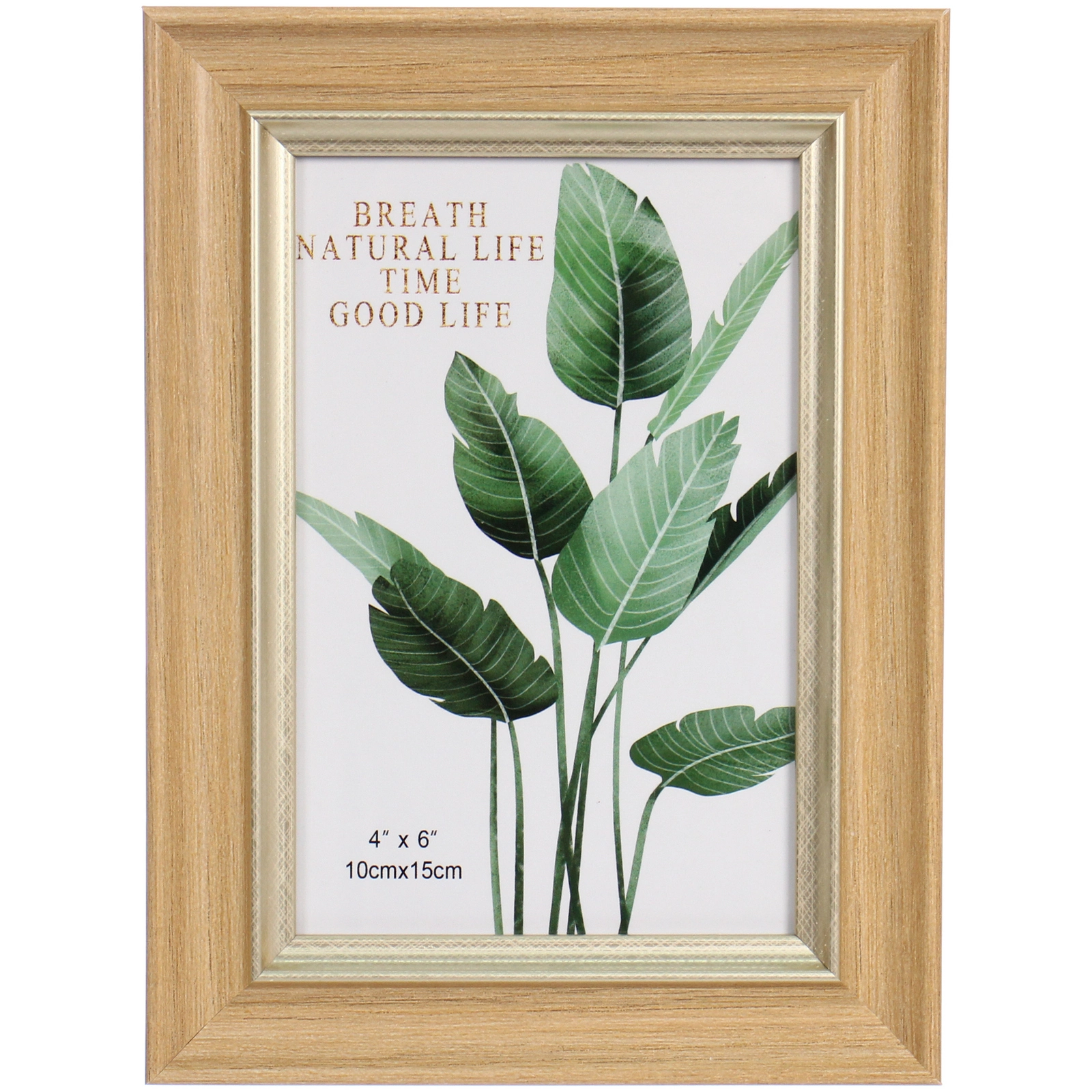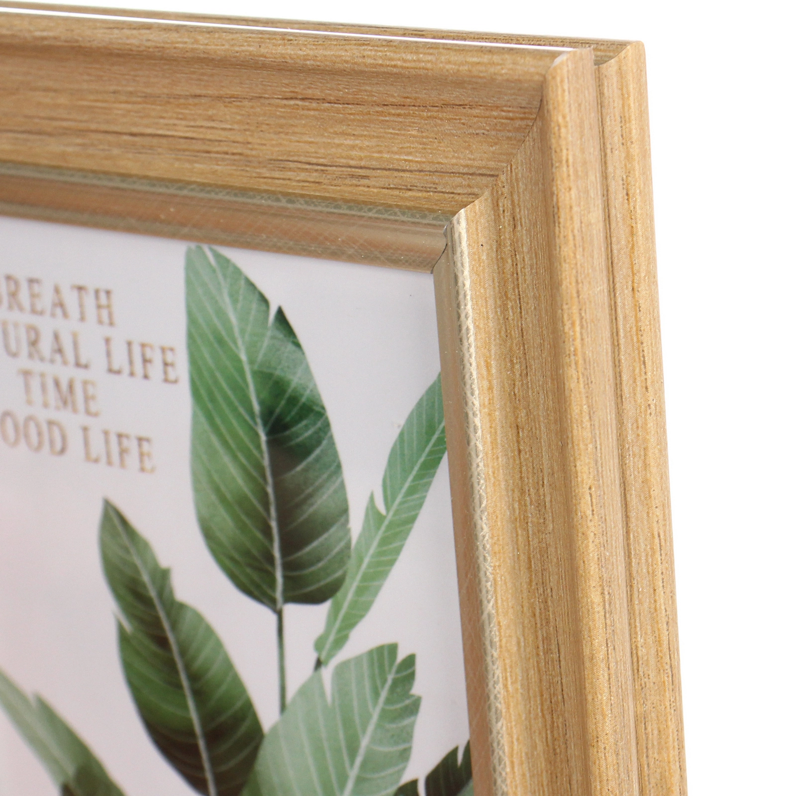 Рамка выполнена в элегантном двухуровневом оформлении: внешний широкий багет имитирует натуральное дерево светло-коричневого цвета, а внутренний узкий профиль имеет благородный металлизированный оттенок. Такое сочетание добавляет глубины и солидности, делая рамку самодостаточным украшением даже без фотографии. В комплекте уже есть стилизованная вставка с мотивирующей надписью «BREATH NATURAL LIFE TIME GOOD LIFE» и изображением зелёных листьев, символизирующих гармонию и рост.