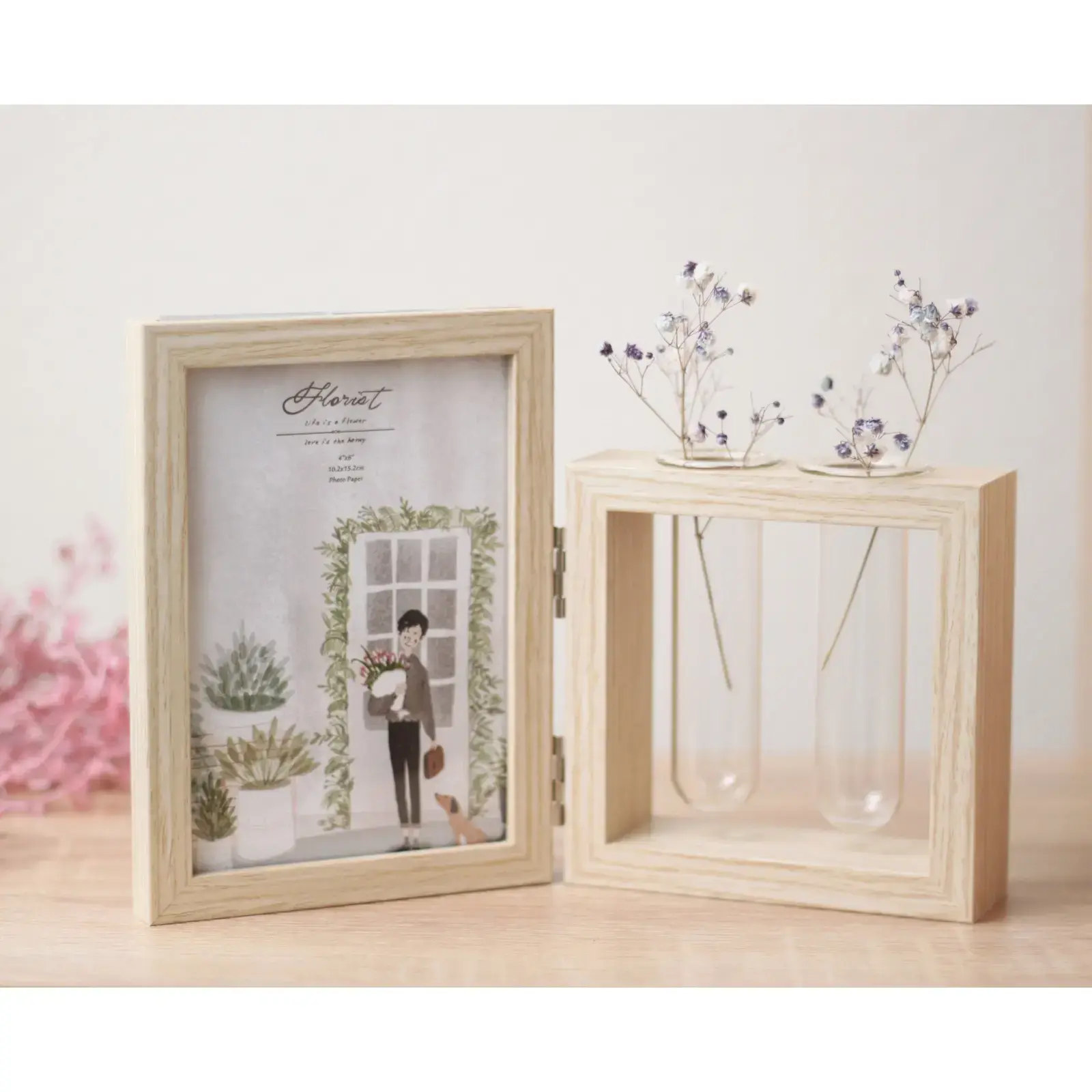 Фоторамка предназначена для размещения фотографии размером 10х15 см и двух пробирок, которые можно использовать для цветов или других декоративных элементов. Она идеально подходит для размещения на столе, полке или в качестве акцента на стене. Рамка станет отличным подарком для друзей и близких, а также стильным дополнением к вашему дому.