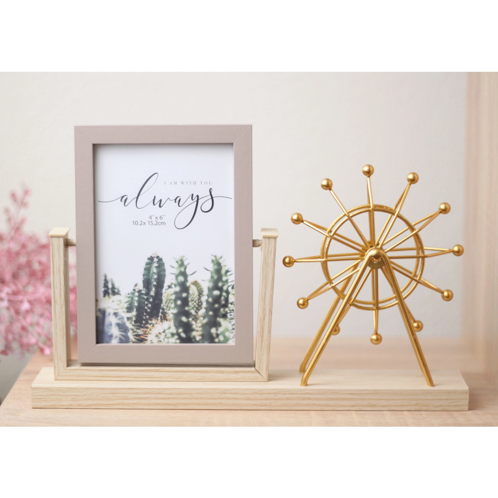 - Готовый декоративный ансамбль: не нужно подбирать отдельные элементы — рамка и декоративное колесо обозрения гармонично сочетаются на одной подставке