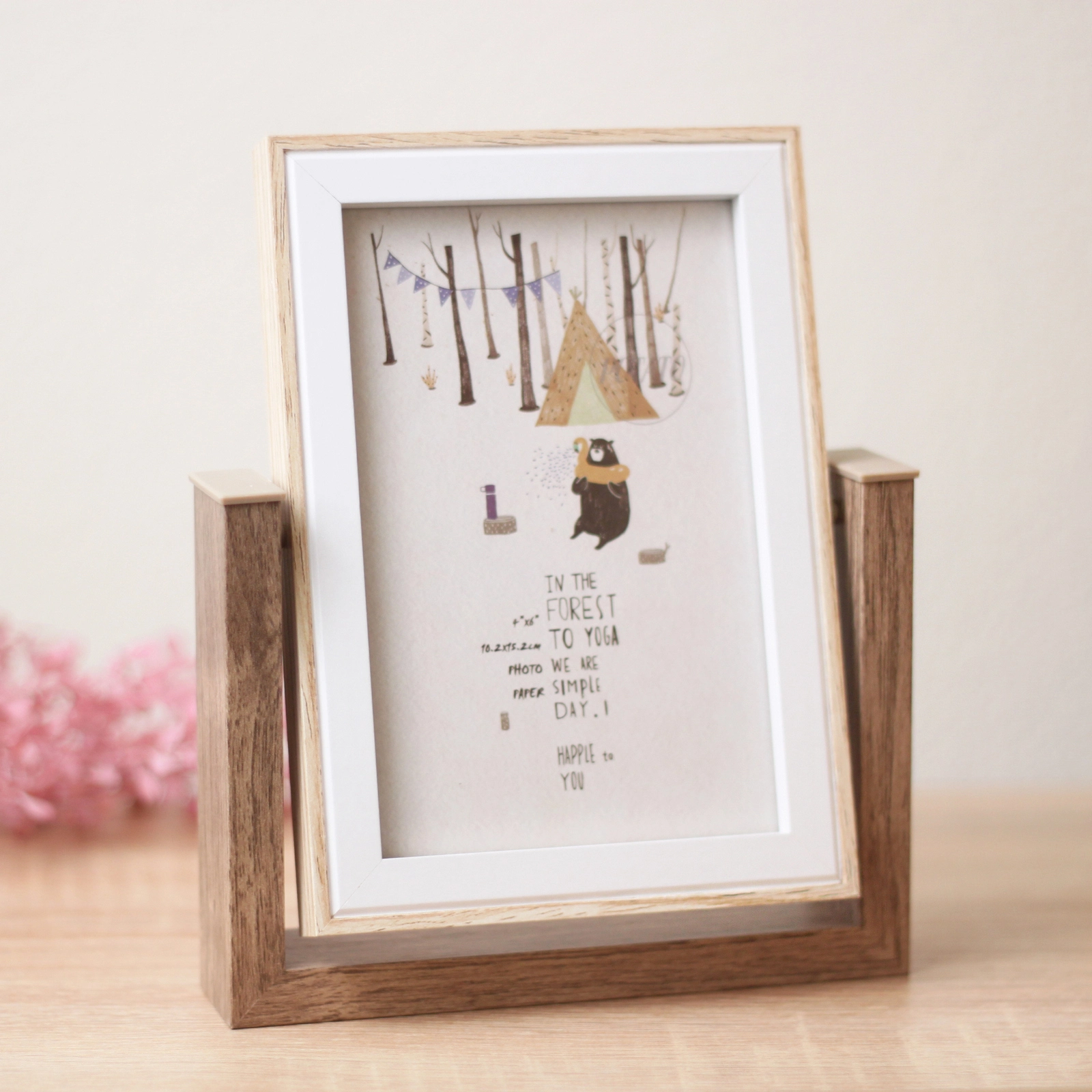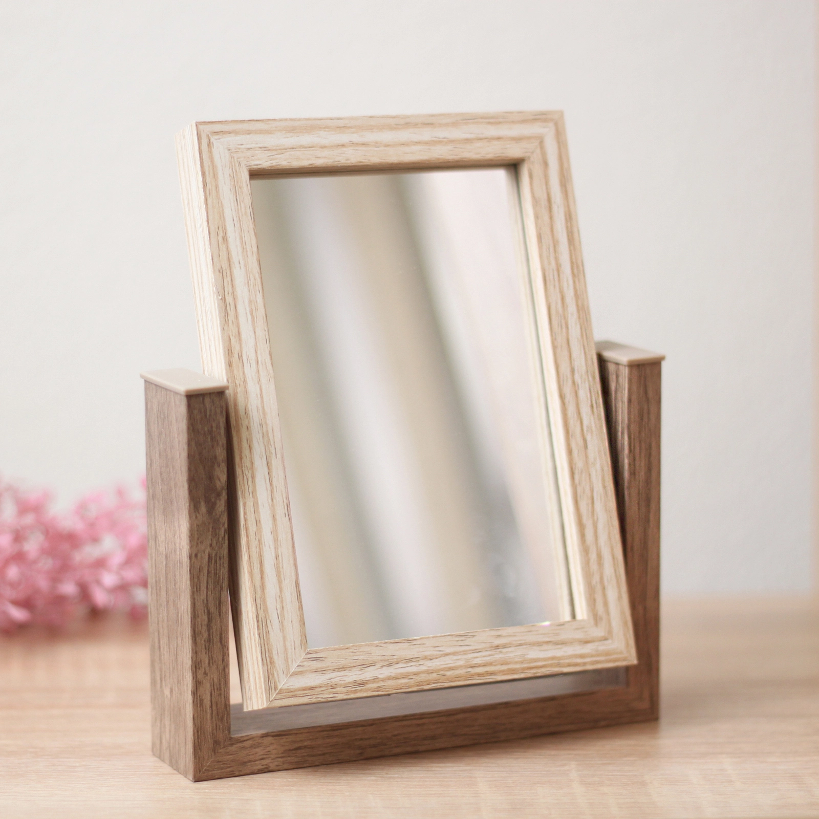 Рамка установлена на устойчивую П-образную подставку из материала, имитирующего тёмное дерево, что обеспечивает надёжное положение на любой поверхности. Конструкция позволяет легко вращать рамку на 180 градусов, выбирая между стороной с фотографией и стороной с зеркалом. Это особенно удобно, когда нужно быстро поправить причёску или проверить внешний вид, не отходя от рабочего места.