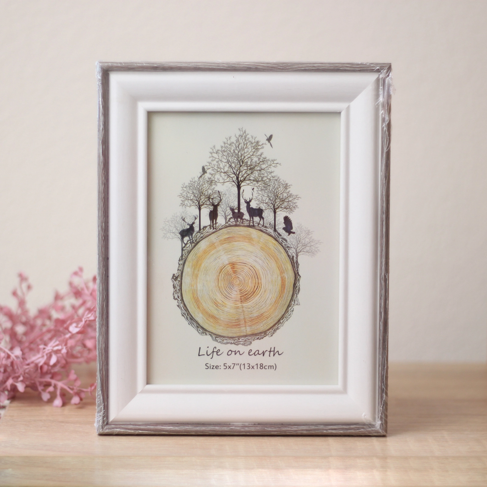 - Уникальный декоративный элемент: В комплекте с рамкой идёт художественная вставка с изображением «Life on earth» — стилизованный спил дерева с силуэтами оленей, птиц и леса, что добавляет изделию особый шарм и готовый эстетический вид.