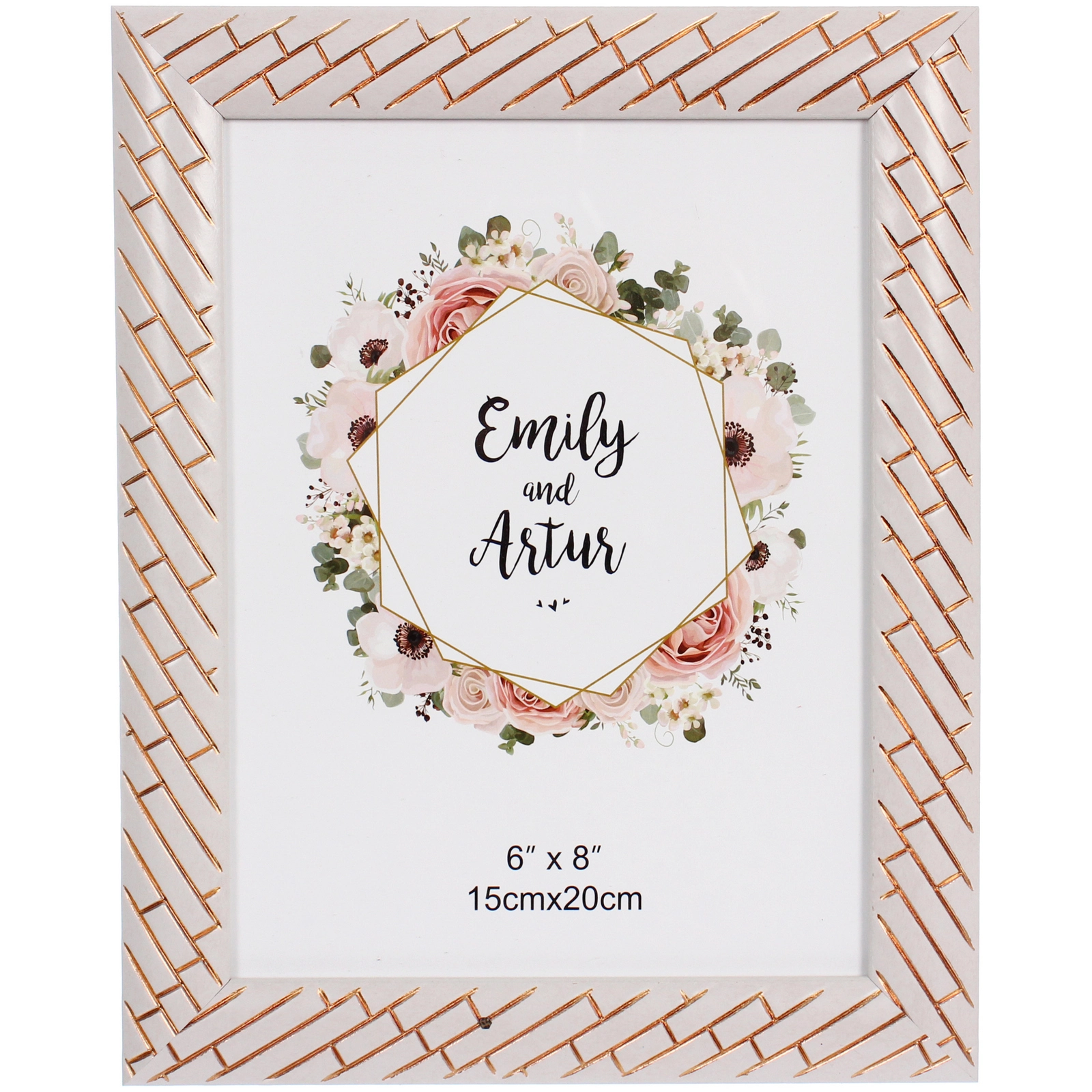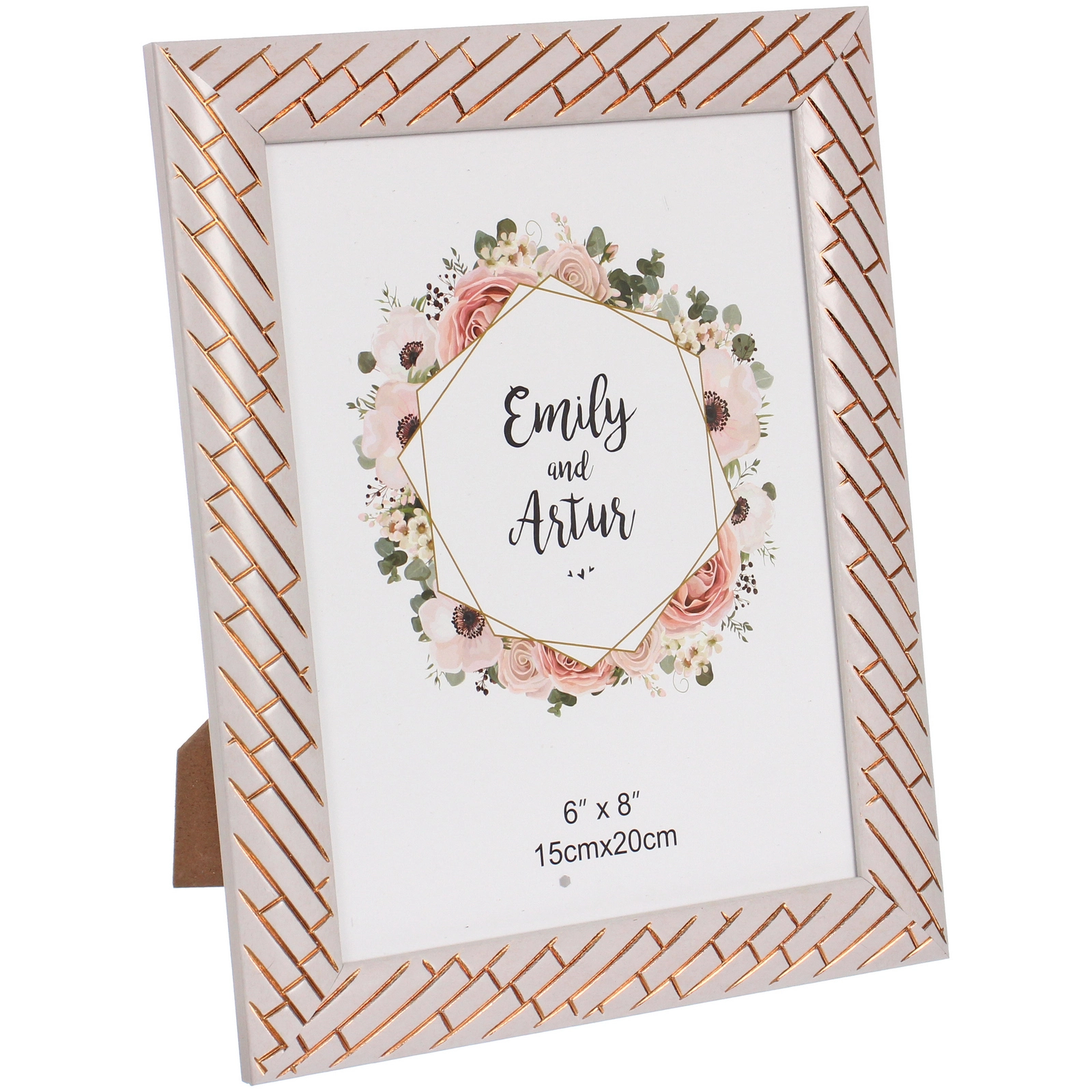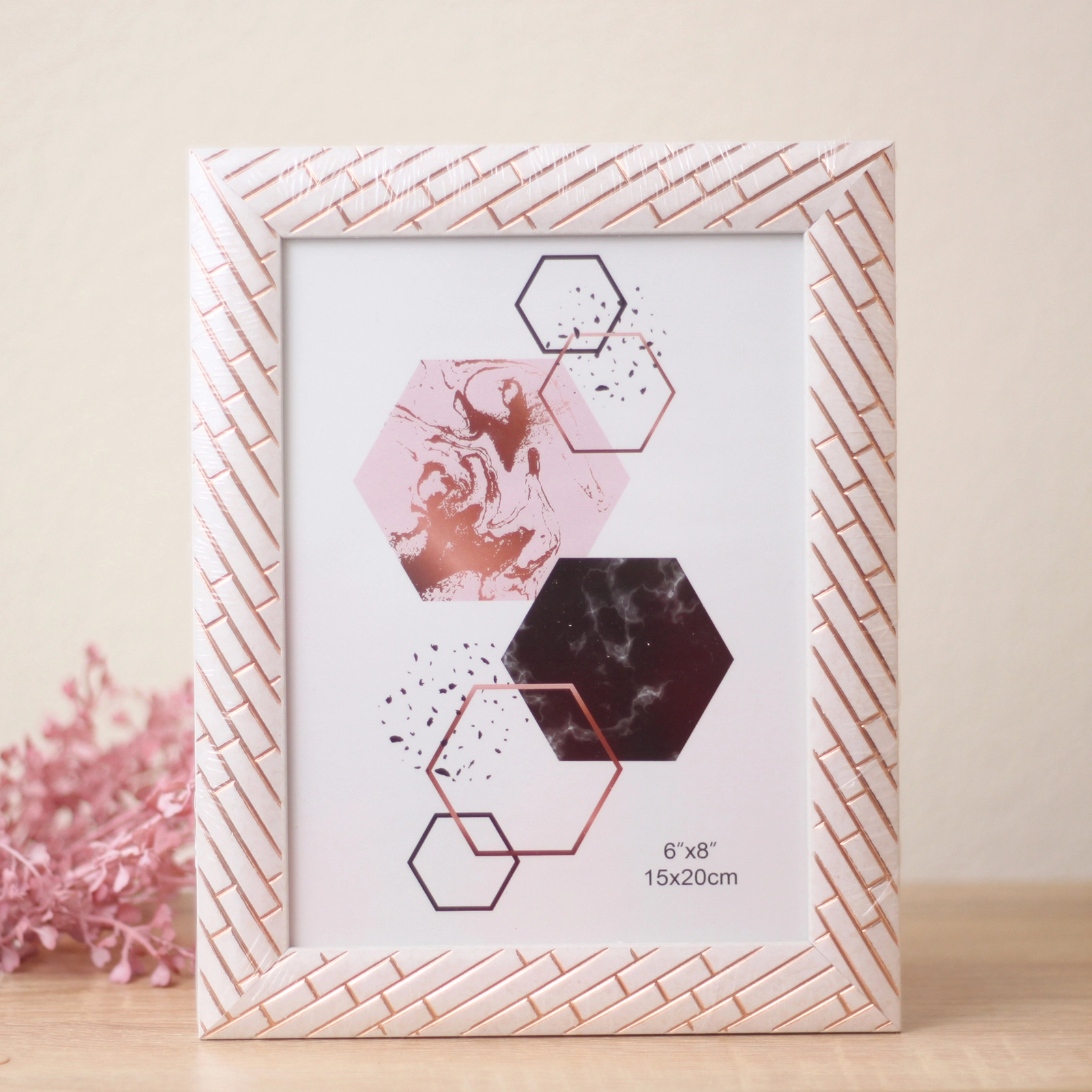 Создайте уютную и стильную атмосферу в интерьере с помощью изящной фоторамки. Эта модель сочетает нежный бледно-розовый оттенок с изысканным золотистым геометрическим узором, напоминающим тонкое плетение или кирпичную кладку. Она станет идеальным обрамлением для ваших самых дорогих фотографий, превратив обычный снимок в настоящее произведение искусства на столе или полке.