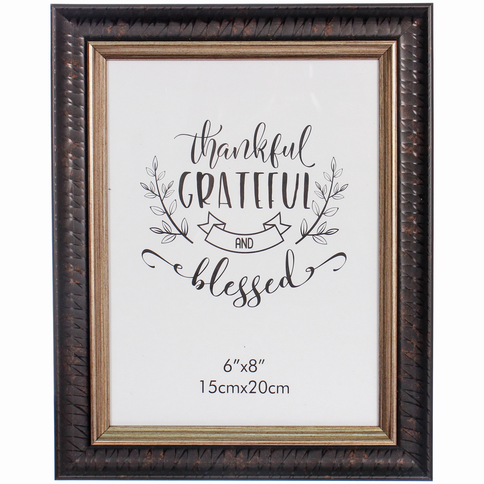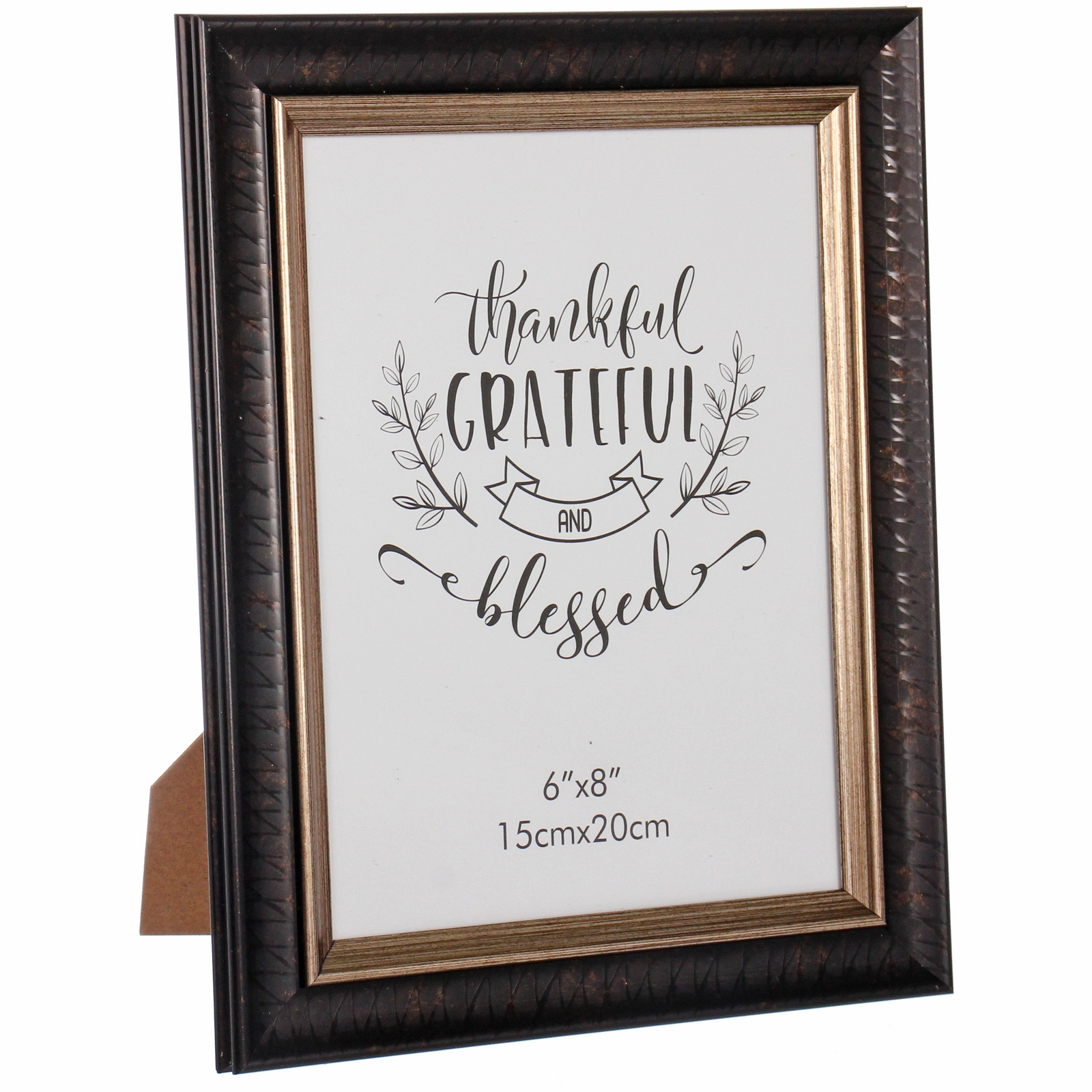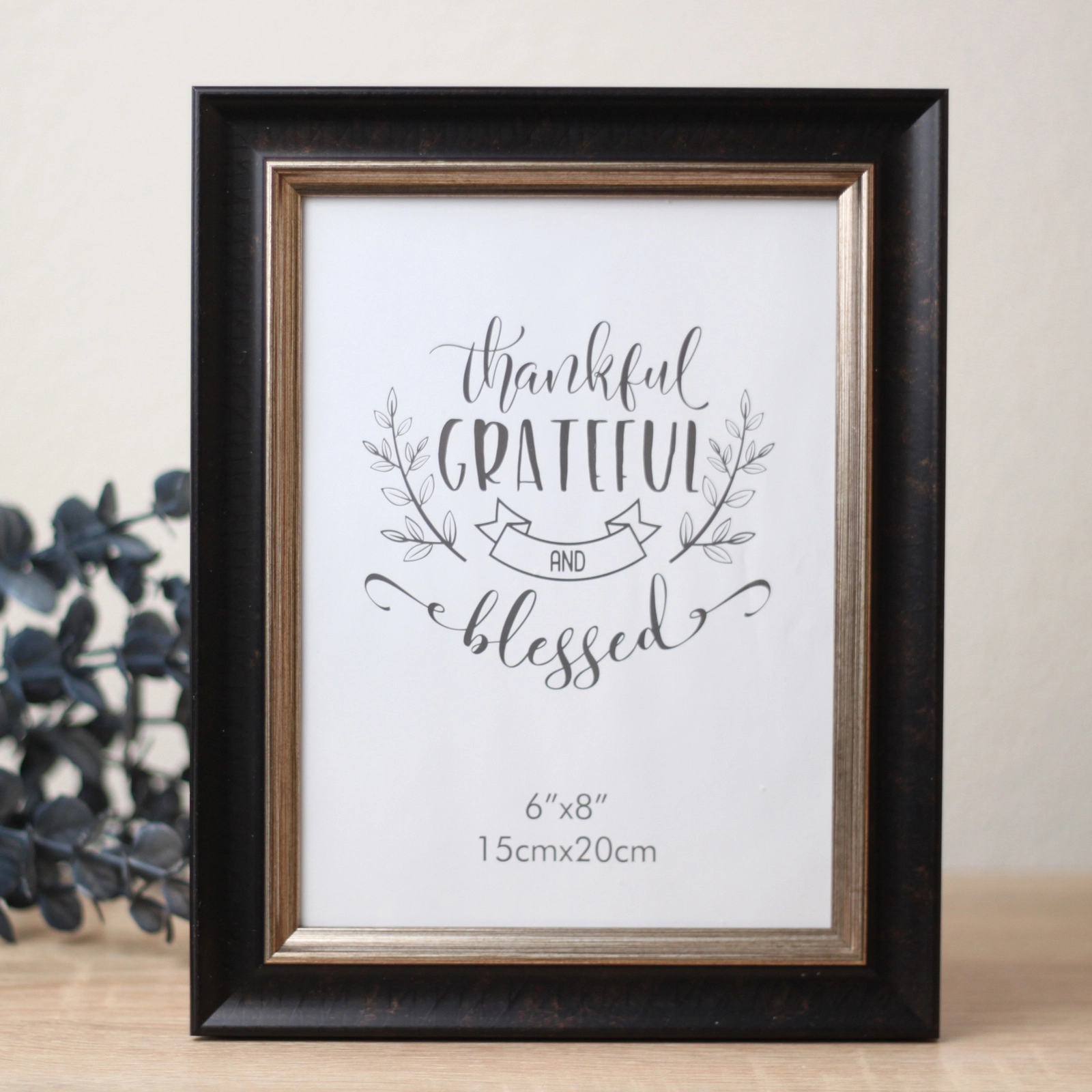 Рамка формата 15x20 см (или 6x8 дюймов) идеально подходит для стандартных фотографий, распечатанных открыток, детских рисунков или мотивирующих постеров. Её вертикальная ориентация прекрасно подчеркивает портретные снимки, изображения с текстом или композиции в высоту. В комплекте уже есть декоративный вкладыш с надписью «thankful GRATEFUL AND blessed» в окружении изящных растительных узоров, который можно сразу использовать или заменить на ваше фото.