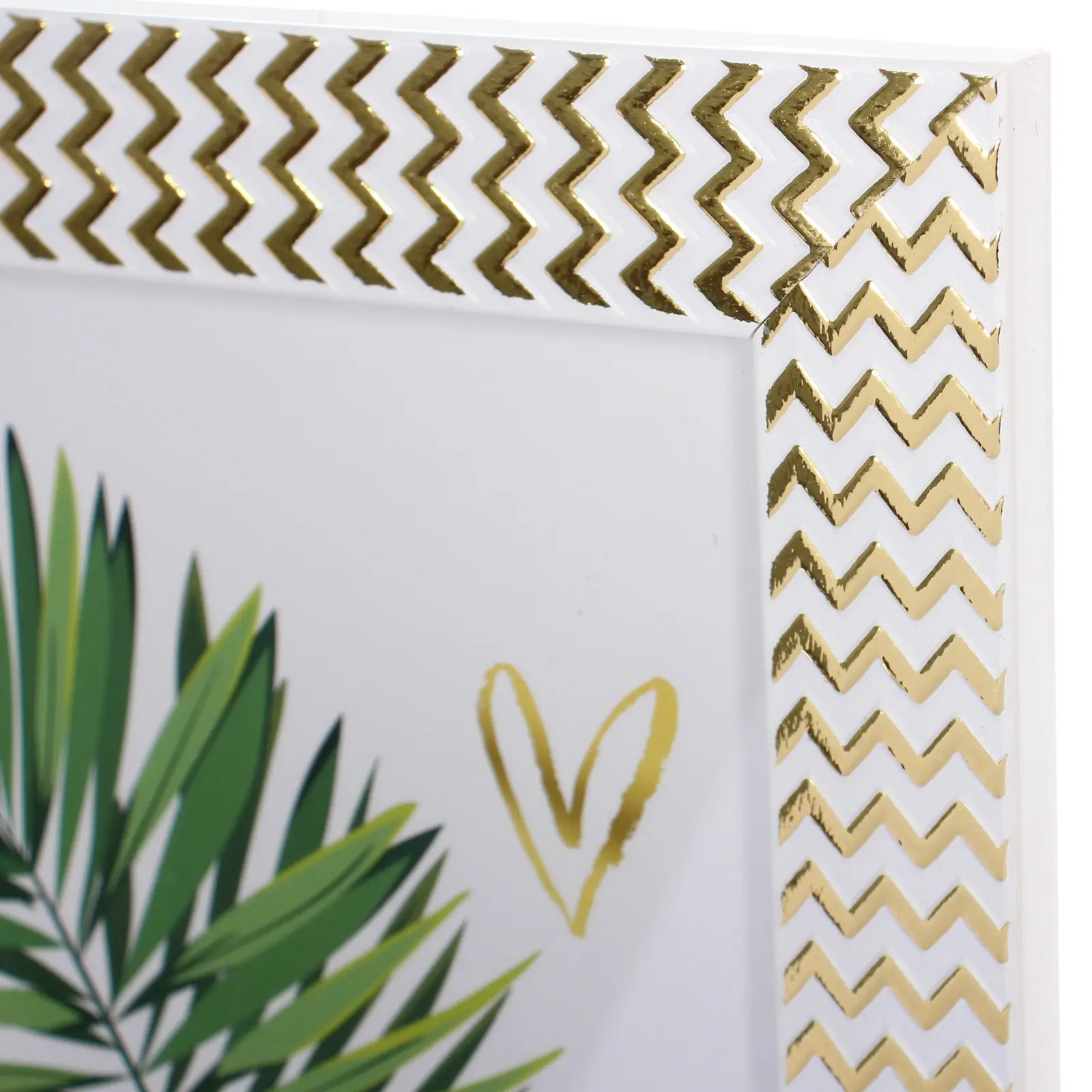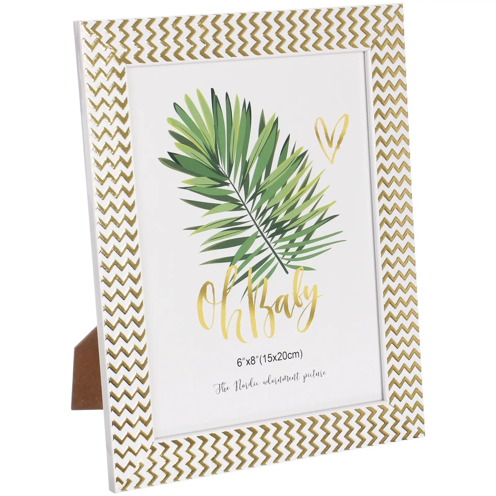 Фоторамка выполнена в белом цвете с золотыми и оранжевыми зигзагообразными узорами, что делает её не только функциональной, но и декоративной. Она станет отличным акцентом в вашем доме, подчеркивая ваш стиль и индивидуальность.