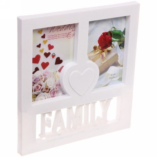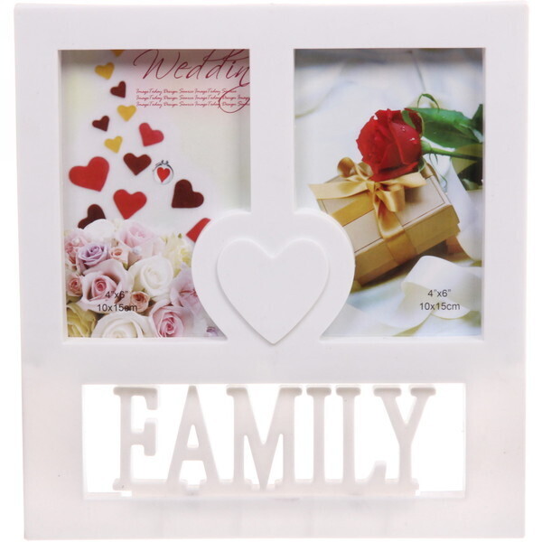 Рамка рассчитана на 2 фотографии размером 10x15 см (4x6"), легко крепится к стене или размещается на полке. Пластиковая конструкция легкая, безопасная и долговечная. Окна для фото удобно расположены по обе стороны от центрального декоративного элемента — сердечка, что позволяет создать гармоничную композицию фрагментов вашей жизни.