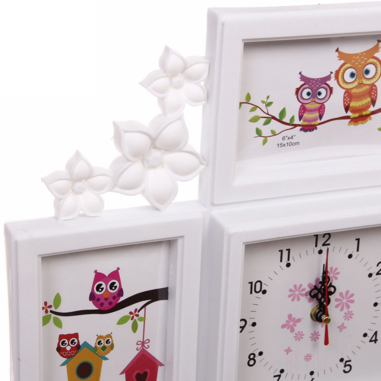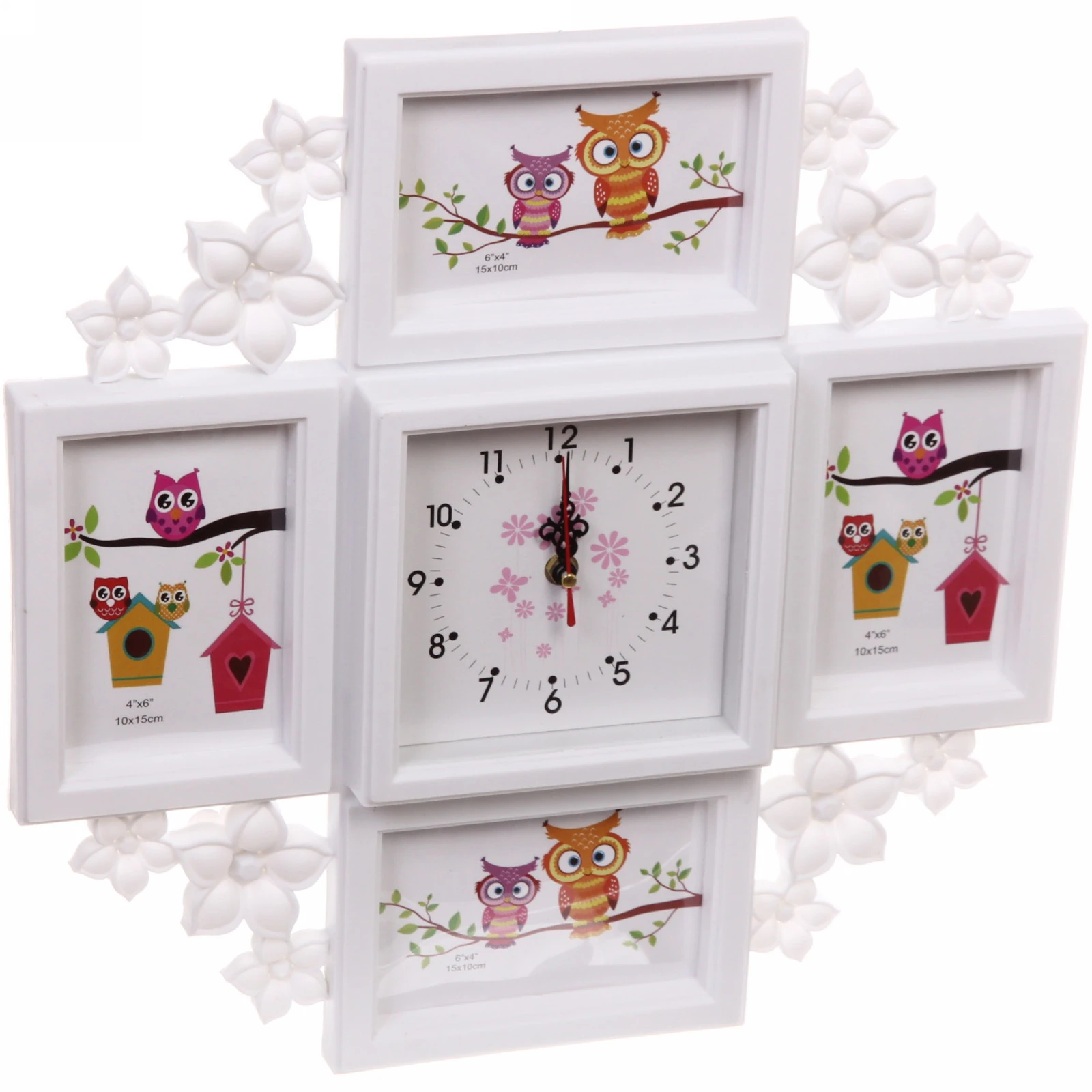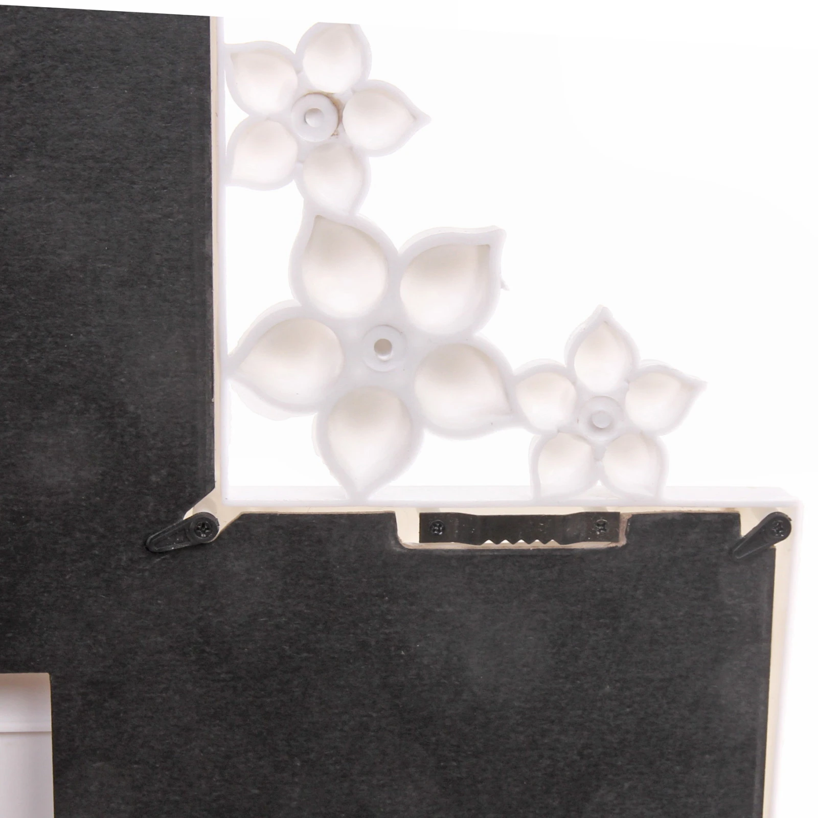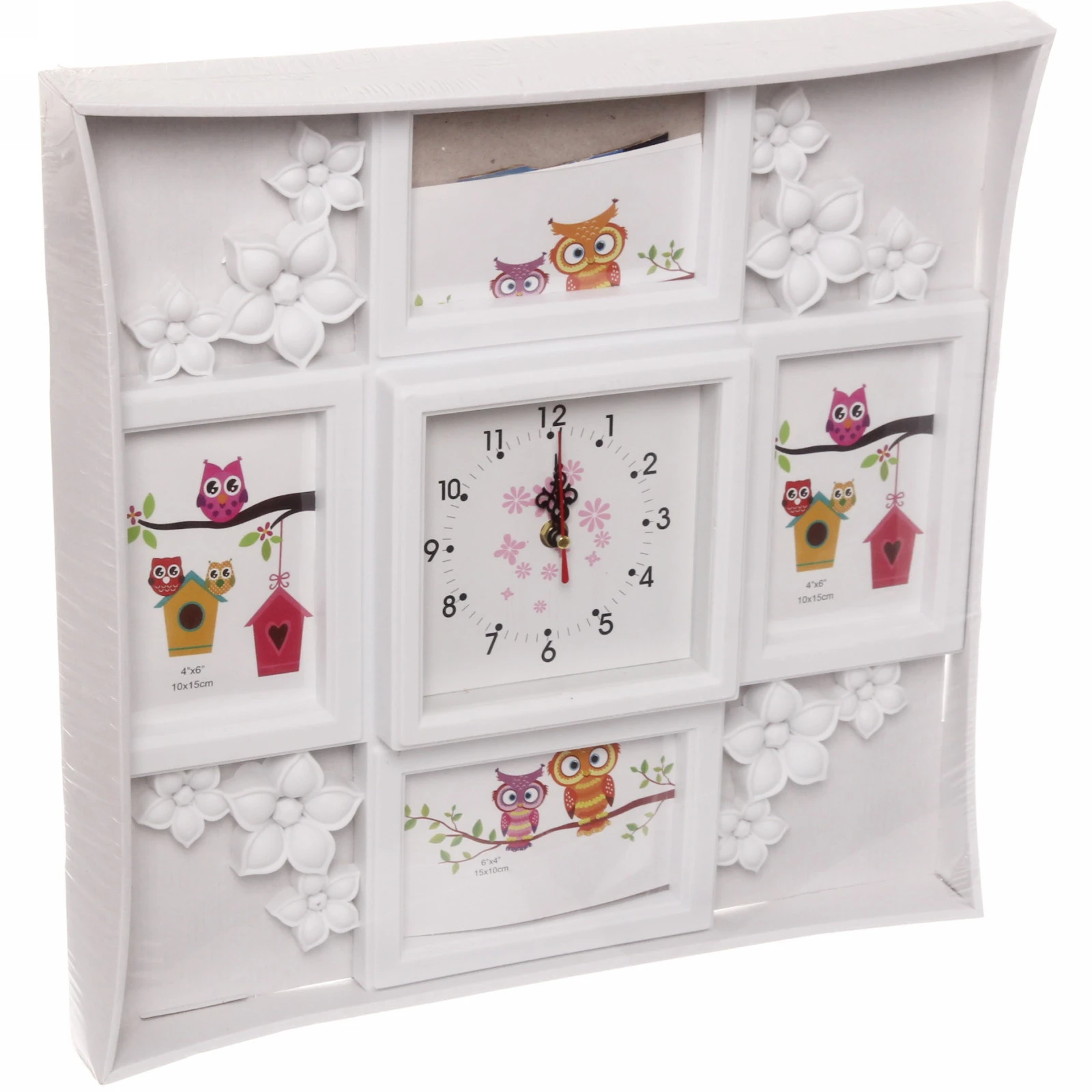 Изделие представляет собой единую композицию из пяти белых пластиковых рамок, объединенных декоративными объемными цветами. В центре расположены классические кварцевые часы с аналоговым циферблатом, украшенным нежным цветочным орнаментом. Четыре дополнительные рамки предназначены для ваших фотографий размером 10x15 см (4"x6") или 15x10 см (6"x4").