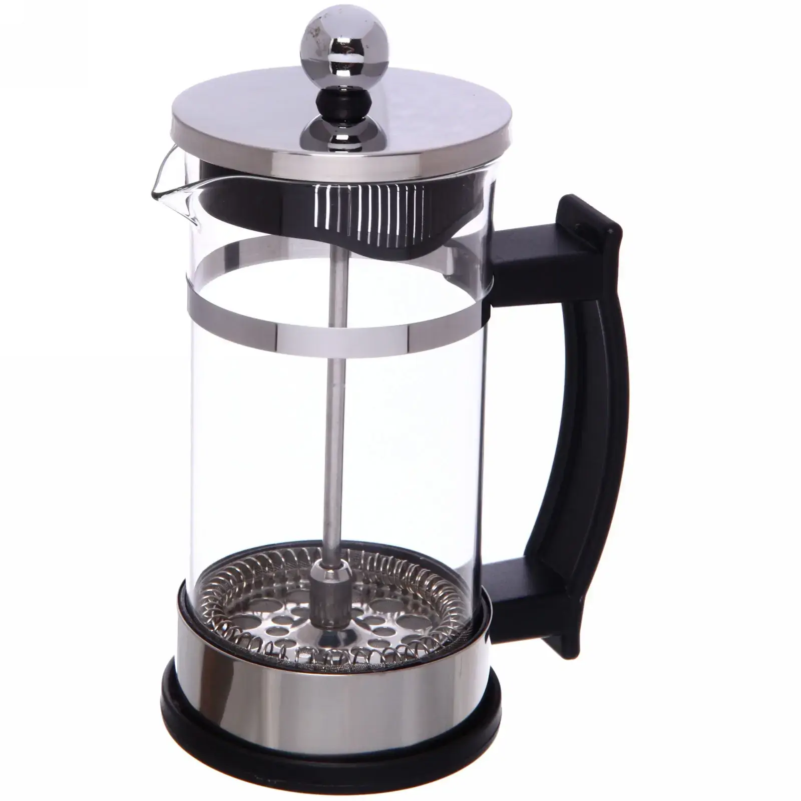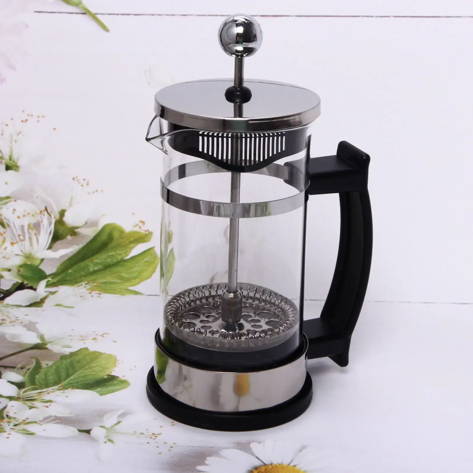 Этот френч-пресс подходит для домашнего использования, работы в офисе или подарка любителям кофе. Прозрачное стекло сочетается с металлическими элементами и черной пластиковой ручкой, создавая современный и стильный дизайн.