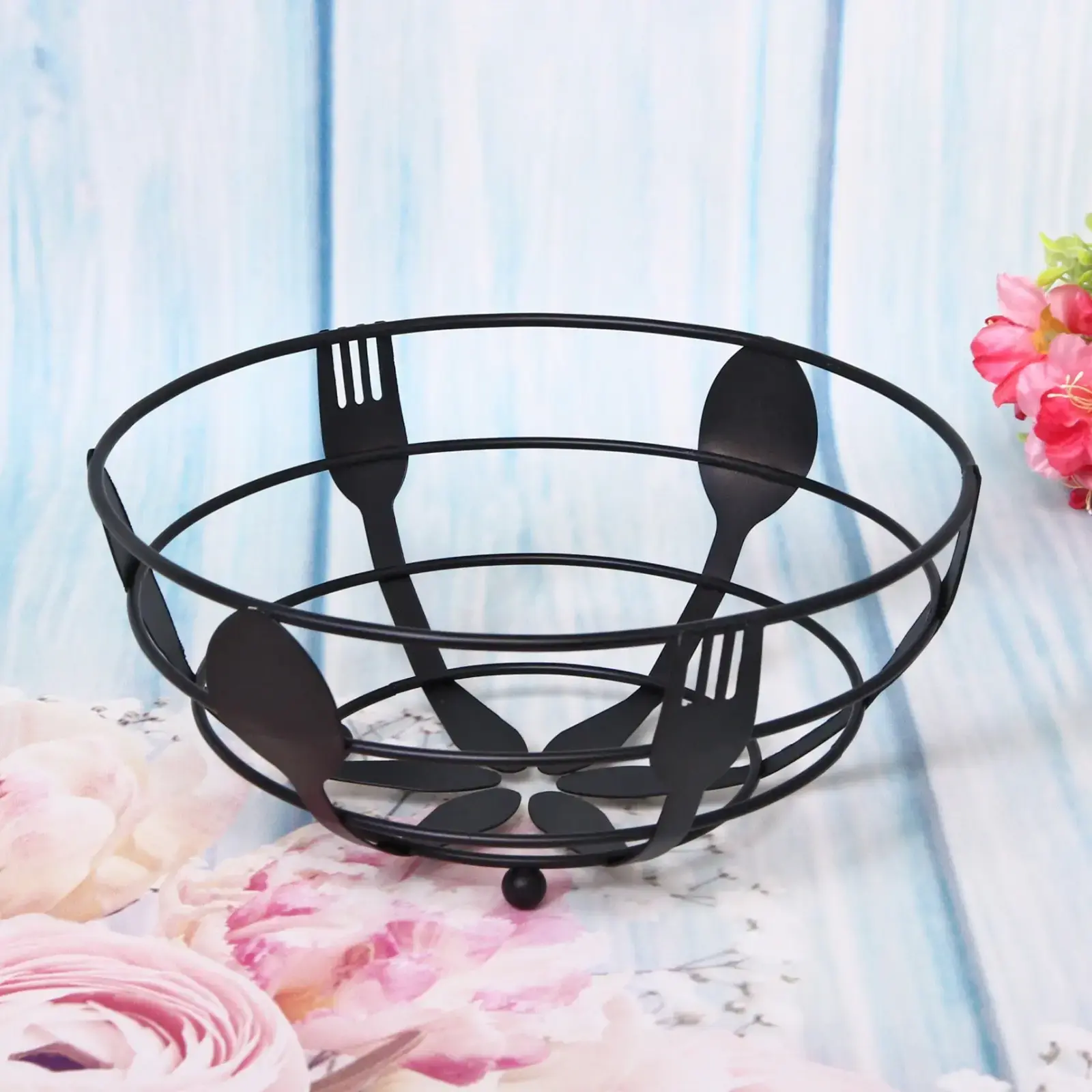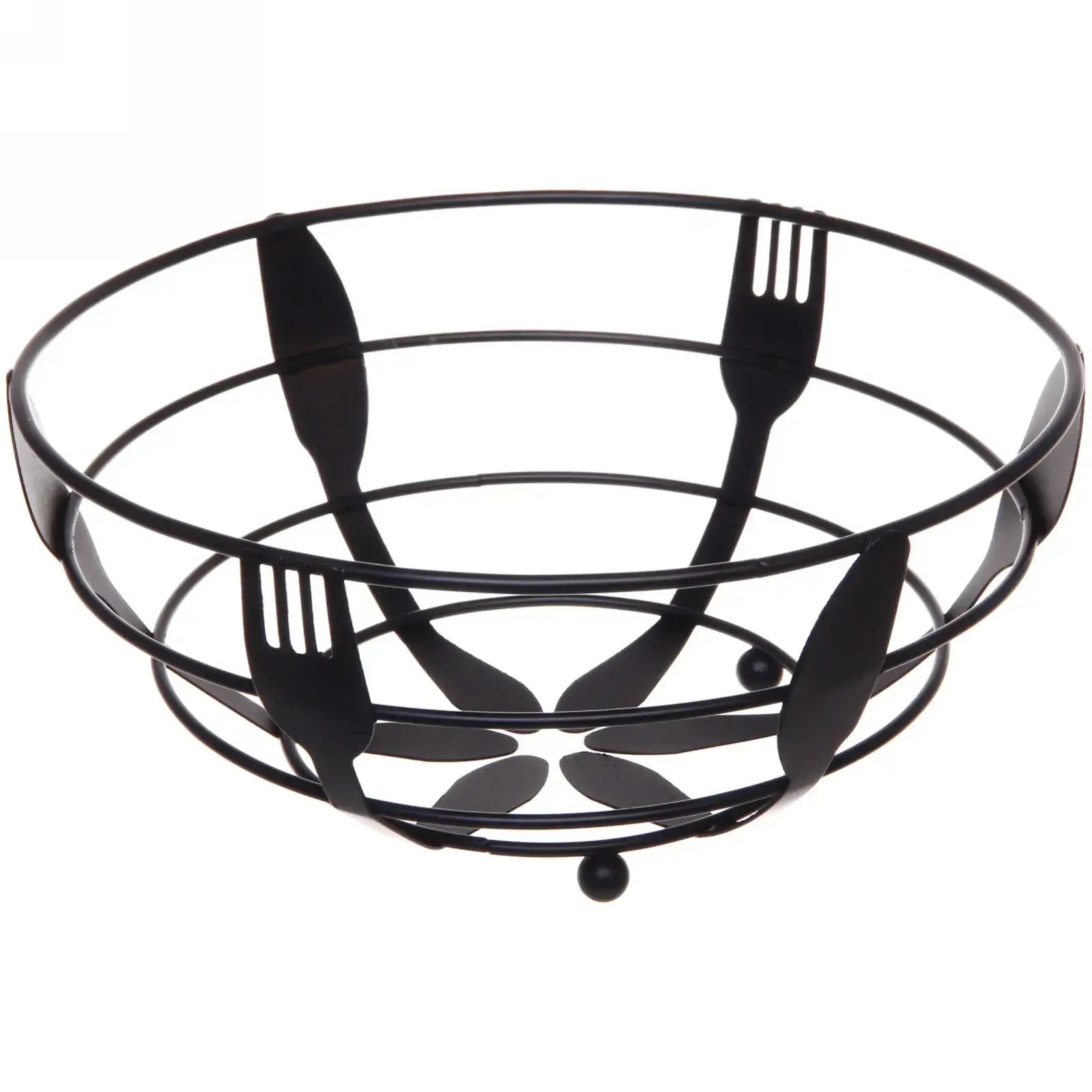 Черный матовый металл гармонично сочетается с любым интерьером. Ажурные элементы в форме вилок и ложек создают эффектную игру света и тени. Универсальная круглая форма позволяет размещать корзину как в центре стола, так и в углу кухонной столешницы.