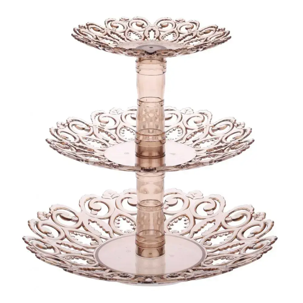 Набор включает 15 пластиковых элементов: 5 базовых подставок диаметром 22 см, 7 соединительных колец высотой 4 см и 3 декоративных верхних яруса. Возможность комбинировать детали обеспечивает вариативность высоты конструкции от 12 до 28 см.