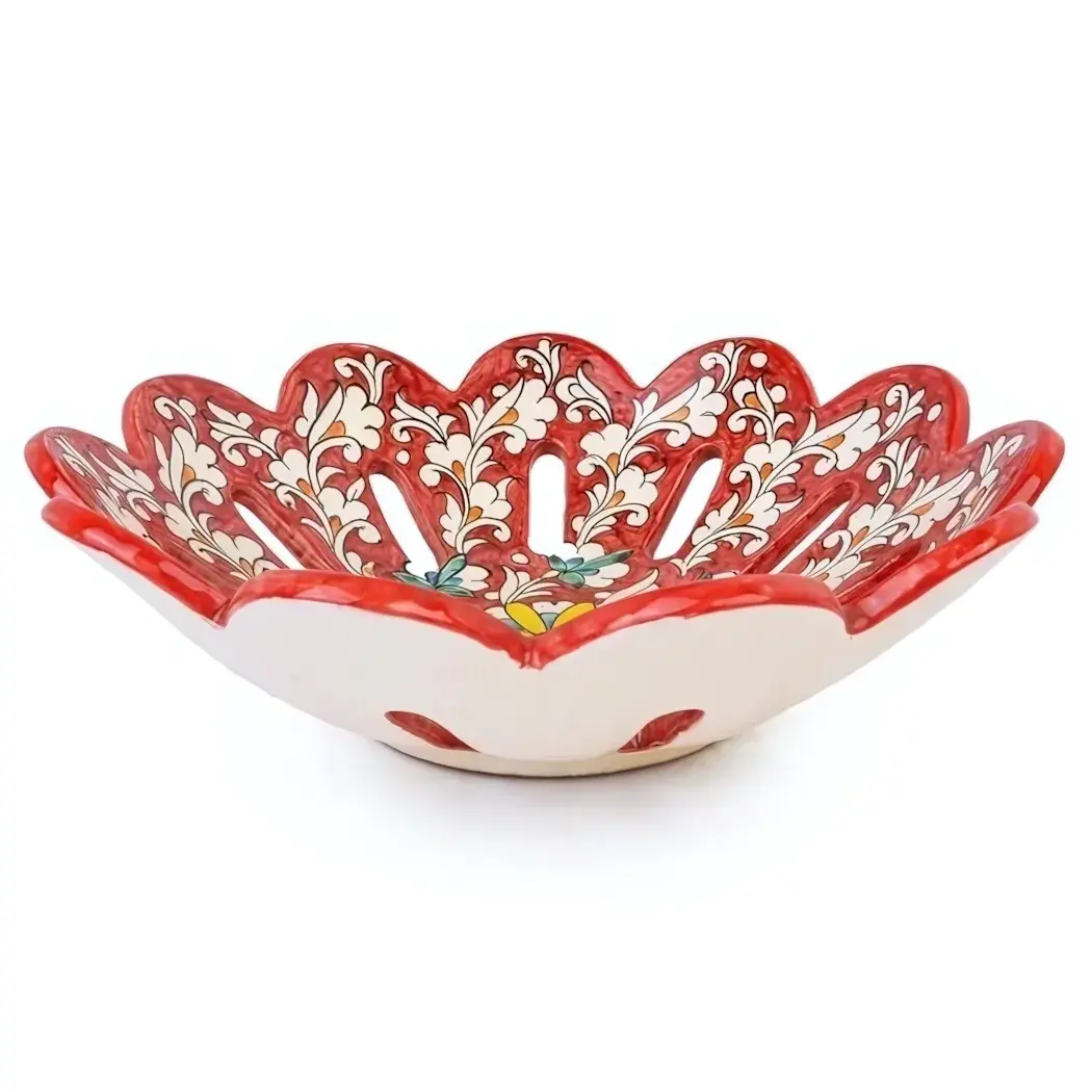 Чаша с рельефными краями подходит не только для фруктов — используйте её как хлебницу, сервировочное блюдо для закусок или стильный элемент декора. Красный фон с контрастными узорами эффектно сочетается с посудой в эко-стиле и классическими сервизами.