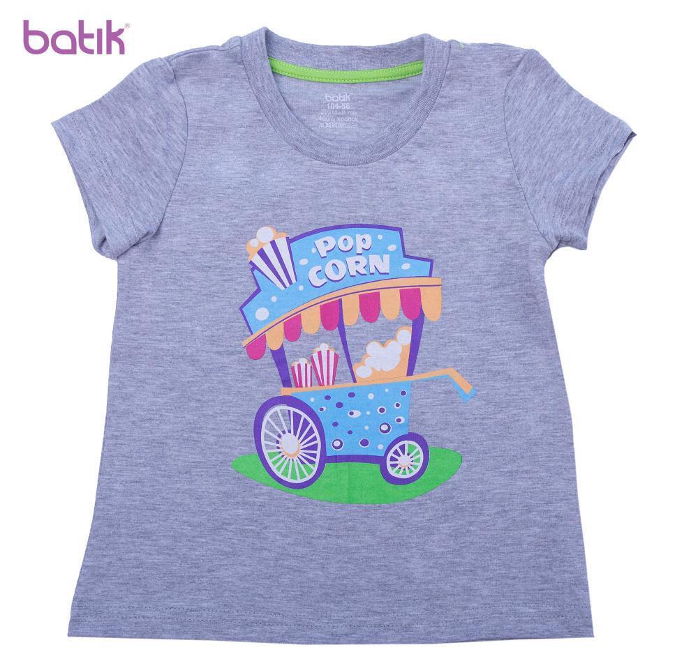 Эта футболка станет любимым элементом гардероба вашего ребенка. Мягкая и приятная на ощупь хлопковая ткань дарит комфорт в течение всего дня, а яркий принт с тележкой попкорна добавляет образу оригинальности и игривого настроения.