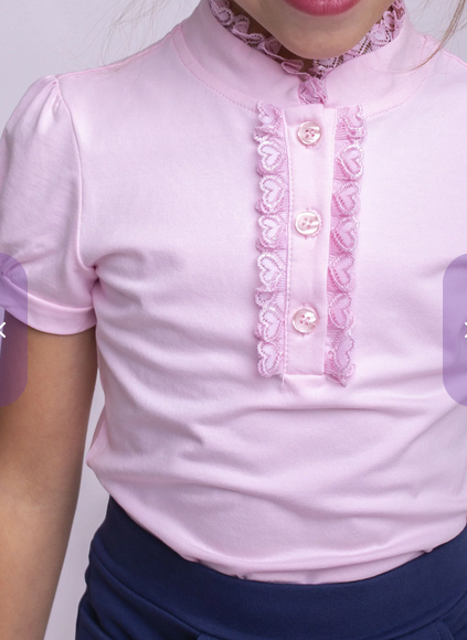 Эта розовая футболка сочетает в себе удобство, мягкость натурального хлопка и аккуратное оформление, которое понравится и ребенку, и родителям. Кружевная отделка в зоне воротника и планки с пуговицами в виде сердечек придает модели милый и изысканный вид, а эластичная ткань с добавлением лайкры обеспечивает идеальную посадку по фигуре и свободу движений.