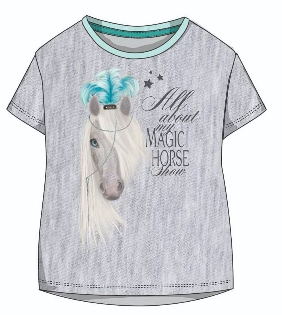 Эта футболка станет любимой вещью в гардеробе вашей дочки. Мягкий хлопковый материал обеспечивает комфорт в течение всего дня, а дышащая ткань предотвращает перегрев даже в жаркую погоду. Яркий и стильный принт с изображением лошади с белой гривой и голубыми перьями обязательно понравится детям, добавляя образу игривости и индивидуальности.
