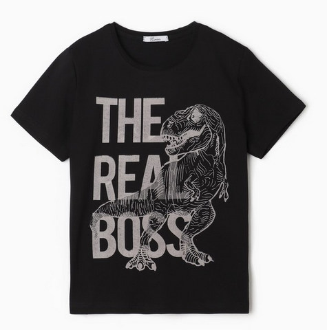 Эта черная футболка с ярким серебристым рисунком динозавра Tyrannosaurus rex и крупной надписью «THE REAL BOSS» станет любимой вещью в гардеробе вашего ребенка. Она сочетает в себе комфорт, долговечность и модный дизайн, позволяя ребенку чувствовать себя уверенно и стильно в любой ситуации.