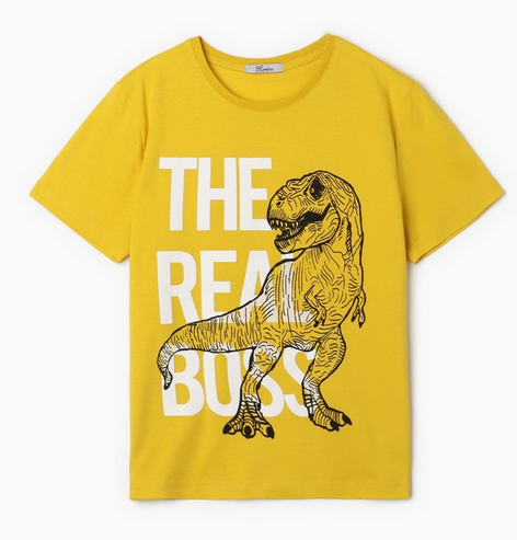 Размер: 128 см (по росту). Цвет: желтый. Материал: хлопок 100 % (кулькавая гладь). Принт: черный, выполнен методом термопереноса, изображает динозавра‑тирана и надпись «THE REAL BOSS». Футболка поставляется в одной штуке.