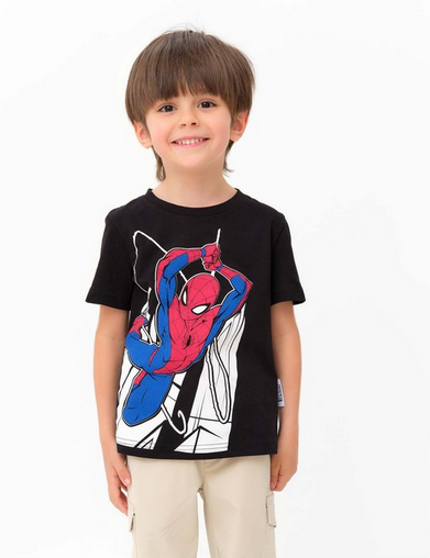 Эта стильная футболка для мальчиков с изображением культового супергероя Человек-Паук порадует каждого маленького поклонника комиксов и фильмов. Яркий принт в красно-синих тонах на фоне насыщенного черного цвета создаёт выразительный контраст, который привлекает внимание и делает образ более динамичным.