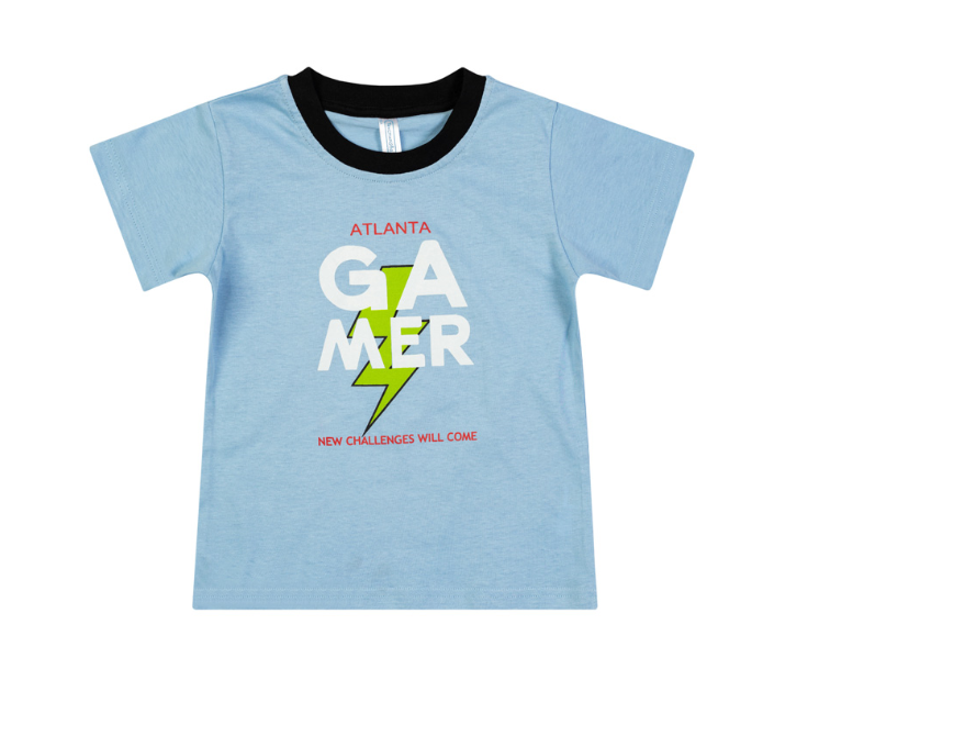 Эта стильная футболка создана для активных мальчиков, которые любят комфорт и интересный дизайн. Светло-голубой цвет в сочетании с черной отделкой по горловине придает изделию современный вид, а крупный принт с надписями "ATLANTA GAMER" и "NEW CHALLENGES WILL COME" делает образ динамичным и выразительным.