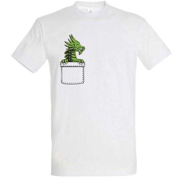 Эта футболка станет отличным выбором для любителей оригинального дизайна и комфорта. Принт с изображением зеленого дракона, выглядывающего из кармана, добавляет уникальности и стиля. Белый цвет футболки позволяет легко сочетать её с различными предметами гардероба, а 100% хлопок обеспечивает приятные ощущения при носке.