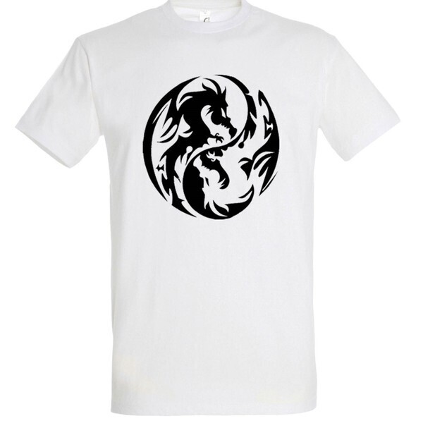 Эта футболка станет отличным дополнением вашего гардероба, обеспечивая комфорт и стиль в повседневной жизни. Принт с изображением двух драконов, изогнутых в форме круга, добавляет уникальности и выразительности. Белый цвет футболки позволяет легко сочетать её с различными элементами одежды, а высококачественный хлопок гарантирует приятные ощущения при носке.