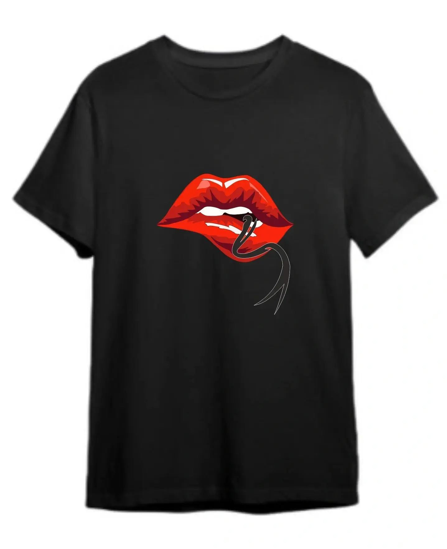 Создайте собственный стиль с футболкой, которая подчеркнет вашу индивидуальность. Эффектный принт в виде красных губ с иглой станет ярким акцентом вашего образа.