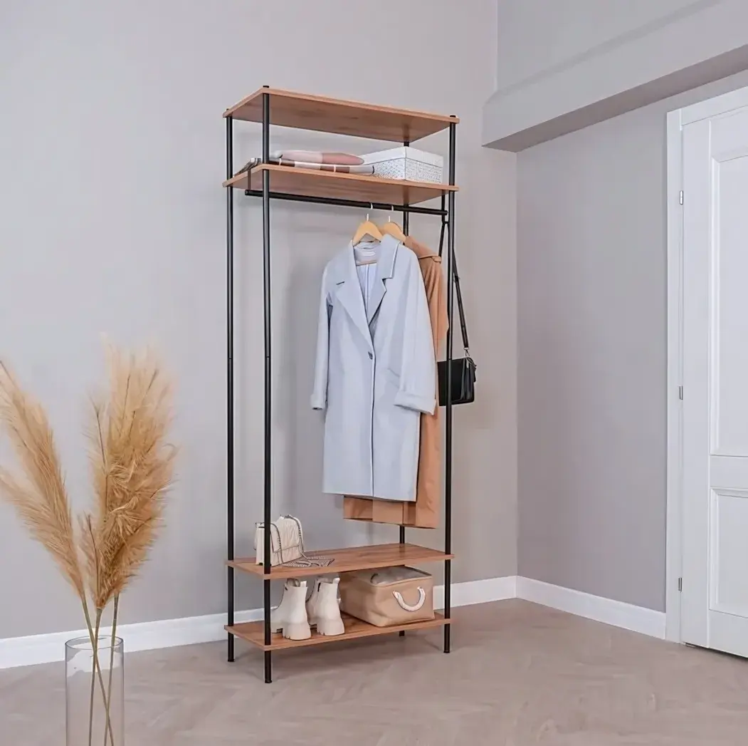 Гардеробная система идеально подходит для хранения одежды, обуви и аксессуаров. Она станет отличным решением для прихожей, спальни или гардеробной комнаты. Система включает три полки: две деревянные и одну верхнюю, выполненную в форме коробки, что позволяет удобно размещать вещи. Расстояние между полками достаточно для хранения как одежды, так и различных аксессуаров.