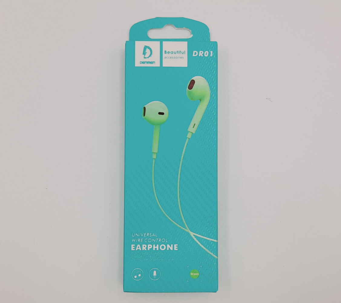 Гарнитура DENMEN DR01 с микрофоном, вкладыши, кабель 1.2 м, зеленый, разъем Jack 3.5 мм