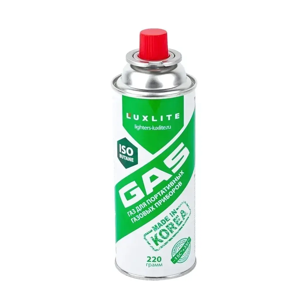 Баллон газовый LUXLITE 220г, изобутан для портативных приборов, защитная крышка, серебристый/зеленый