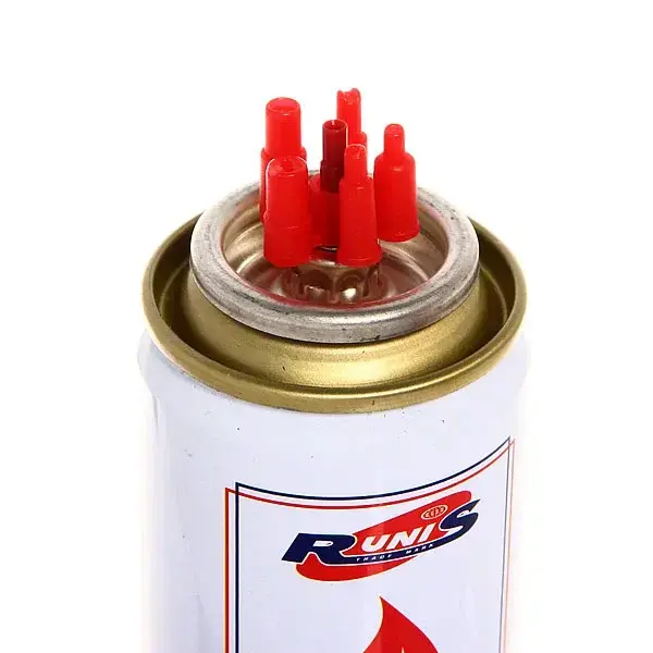 Белый металлический баллон газа 'RUNIS' объемом 140мл станет вашим надежным помощником в быту. Специальные насадки в комплекте обеспечивают точный и безопасный процесс заправки любых типов зажигалок.