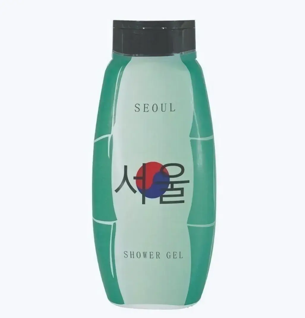 Объем флакона составляет 530 мл, что обеспечивает длительное использование. Основной цвет флакона — зеленый с прозрачным оттенком, а черная крышка добавляет элегантности. На упаковке присутствуют надписи на английском и корейском языках, что подчеркивает его уникальность и связь с культурой Сеула.