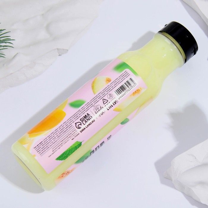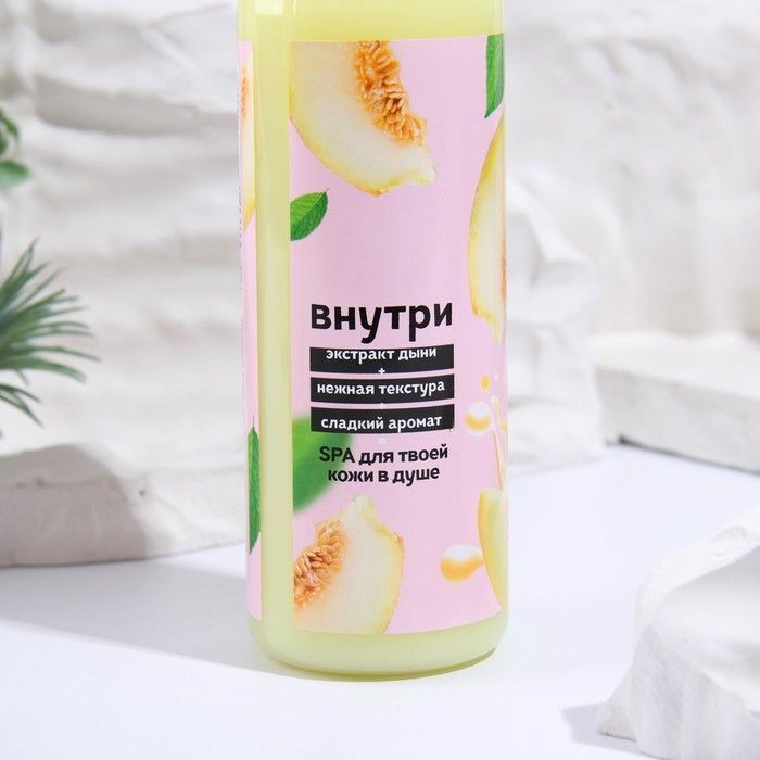 Объем флакона составляет 350 мл, что обеспечивает длительное использование. Флакон имеет удобную форму и закручивающуюся крышку, что делает его практичным в использовании. Цвет геля светло-желтый, а оформление этикетки в пастельных тонах с изображением дынь и зелёных листьев добавляет эстетики вашему душевому пространству.