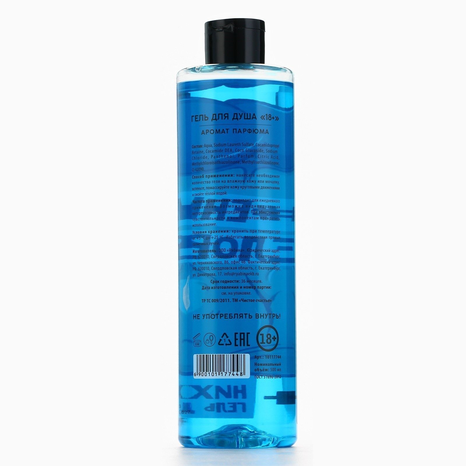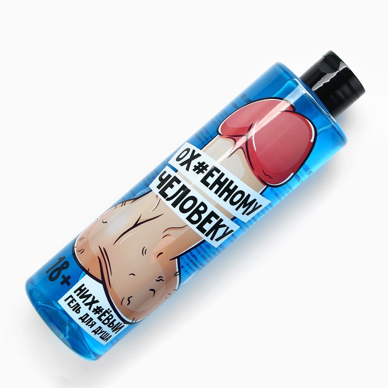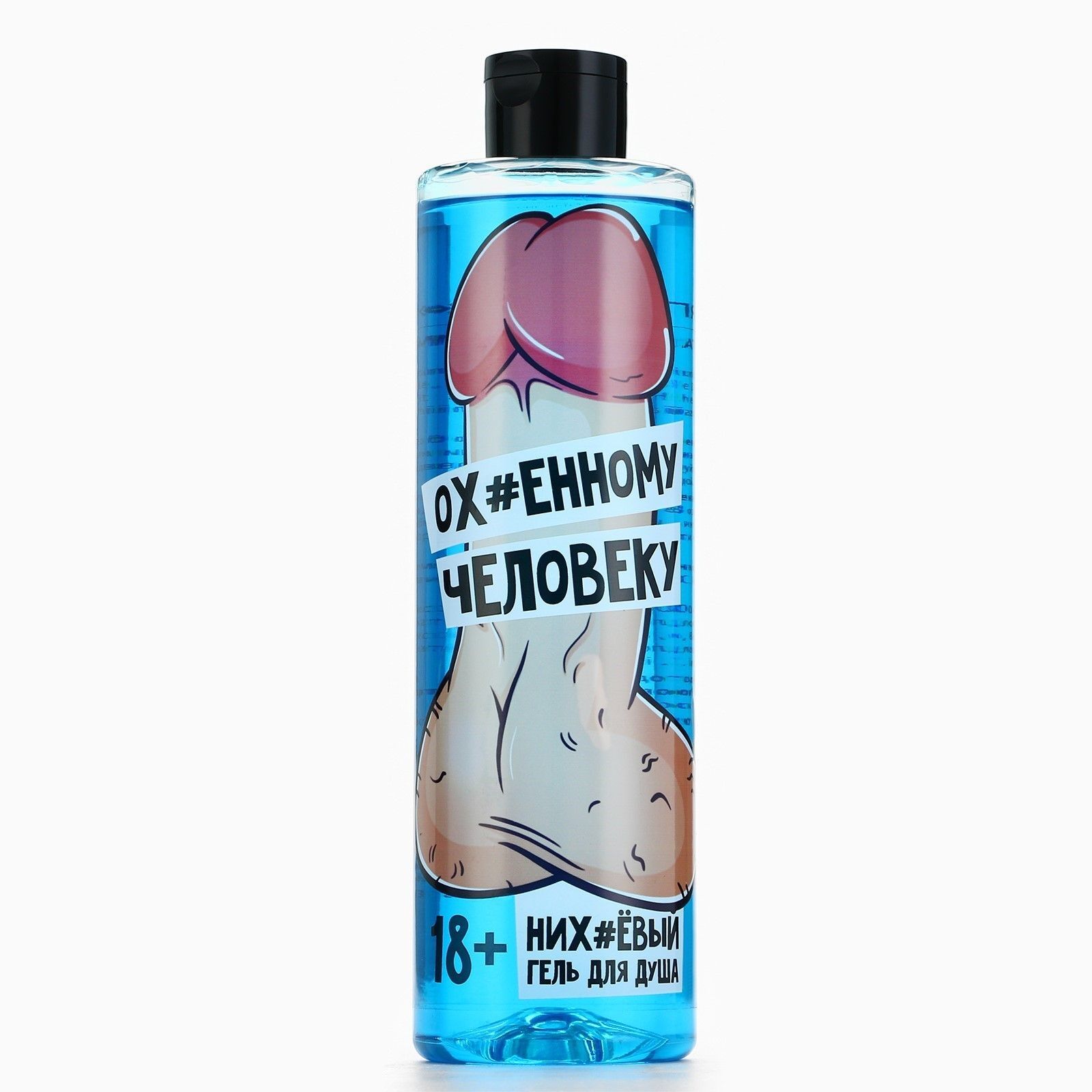 Объем флакона составляет 500 мл, что обеспечивает длительное использование. Упаковка выполнена из прозрачного пластика с голубым оттенком, а черная крышка надежно закрывает флакон. Не забывайте, что данный продукт предназначен для взрослой аудитории (18+), что делает его отличным подарком для мужчин с чувством юмора.