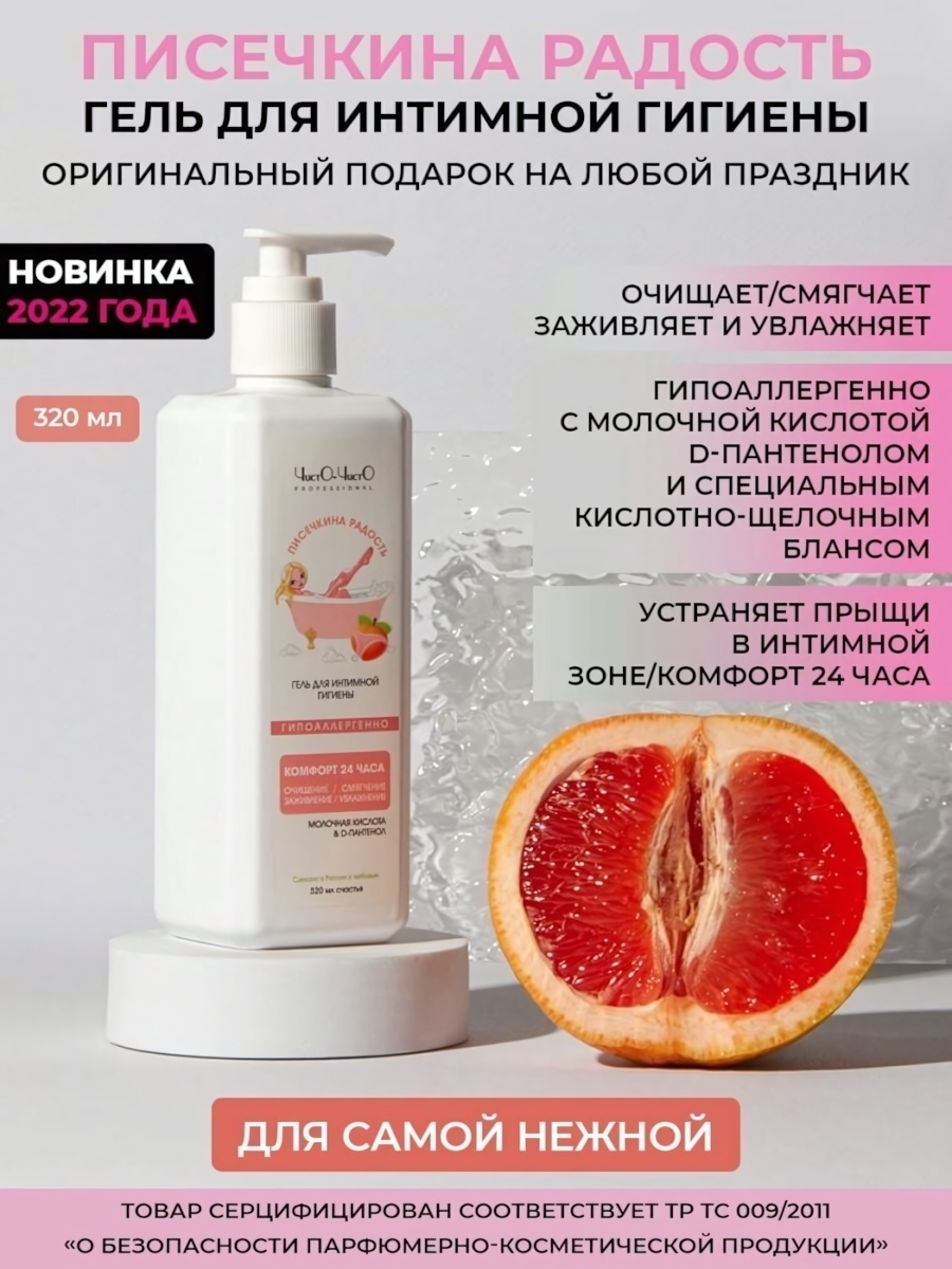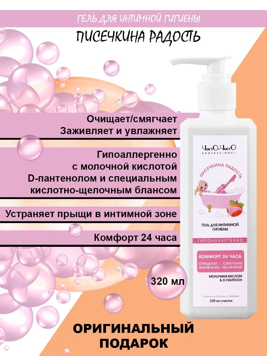 Нежный гель 'Писечкина радость' создан специально для деликатного очищения интимной зоны. Молочная кислота и D-пантенол в составе поддерживают естественный баланс кожи, обеспечивая комфорт на целый день.